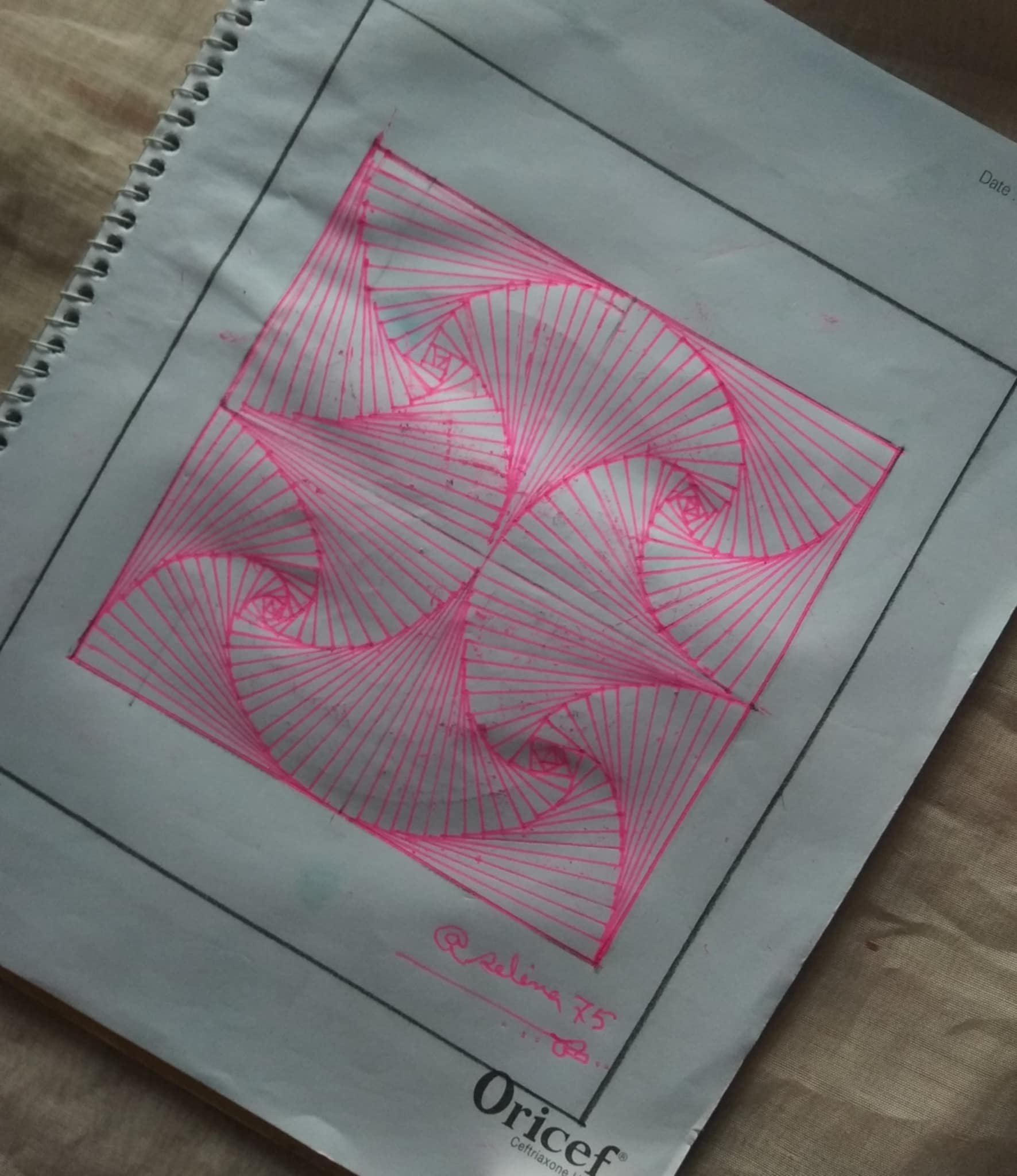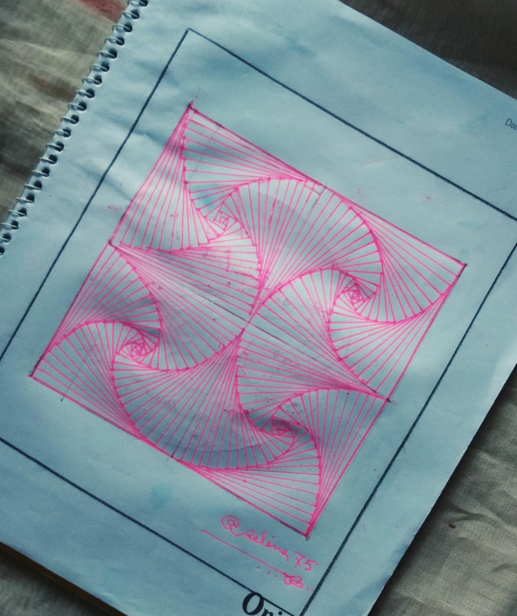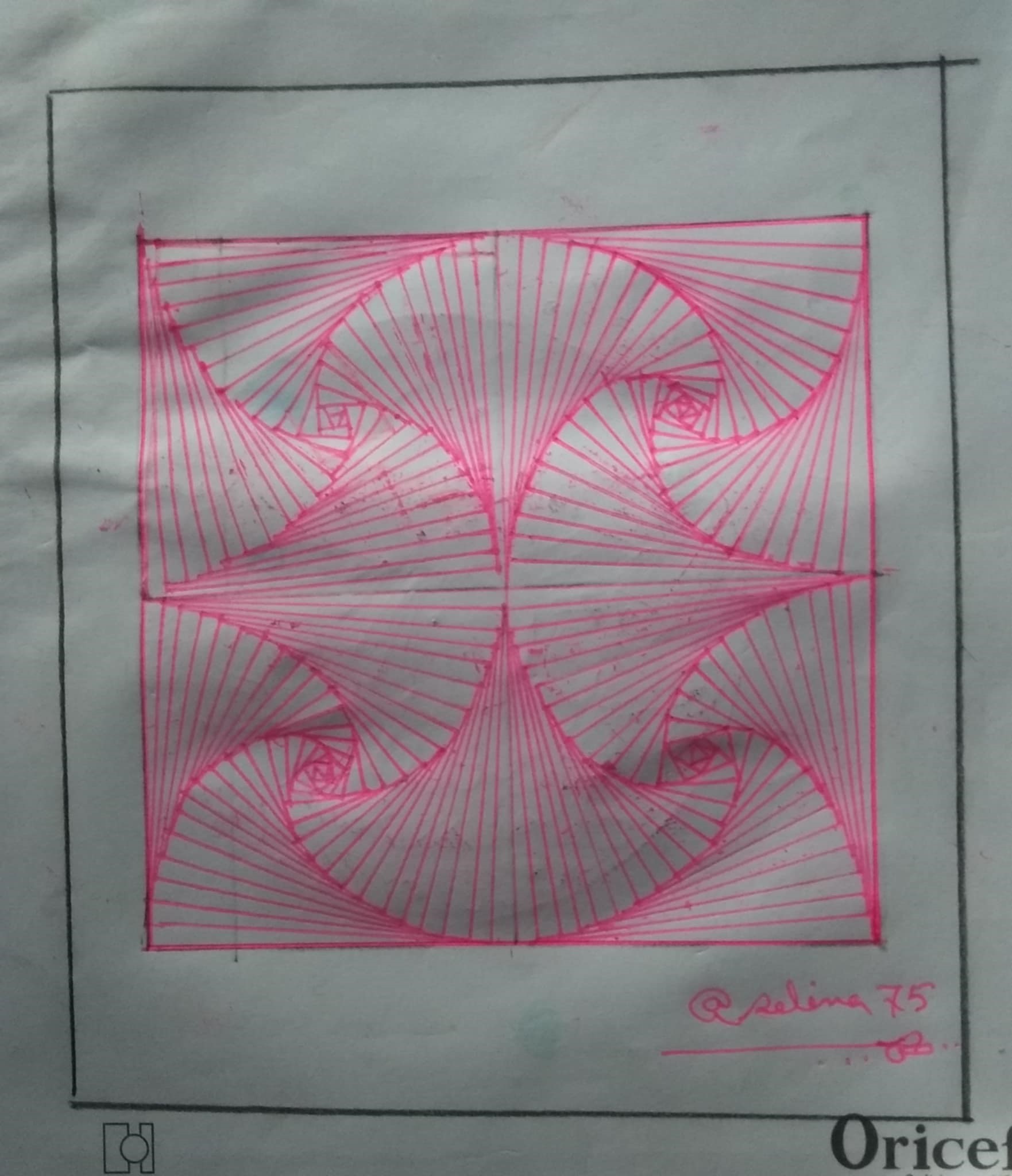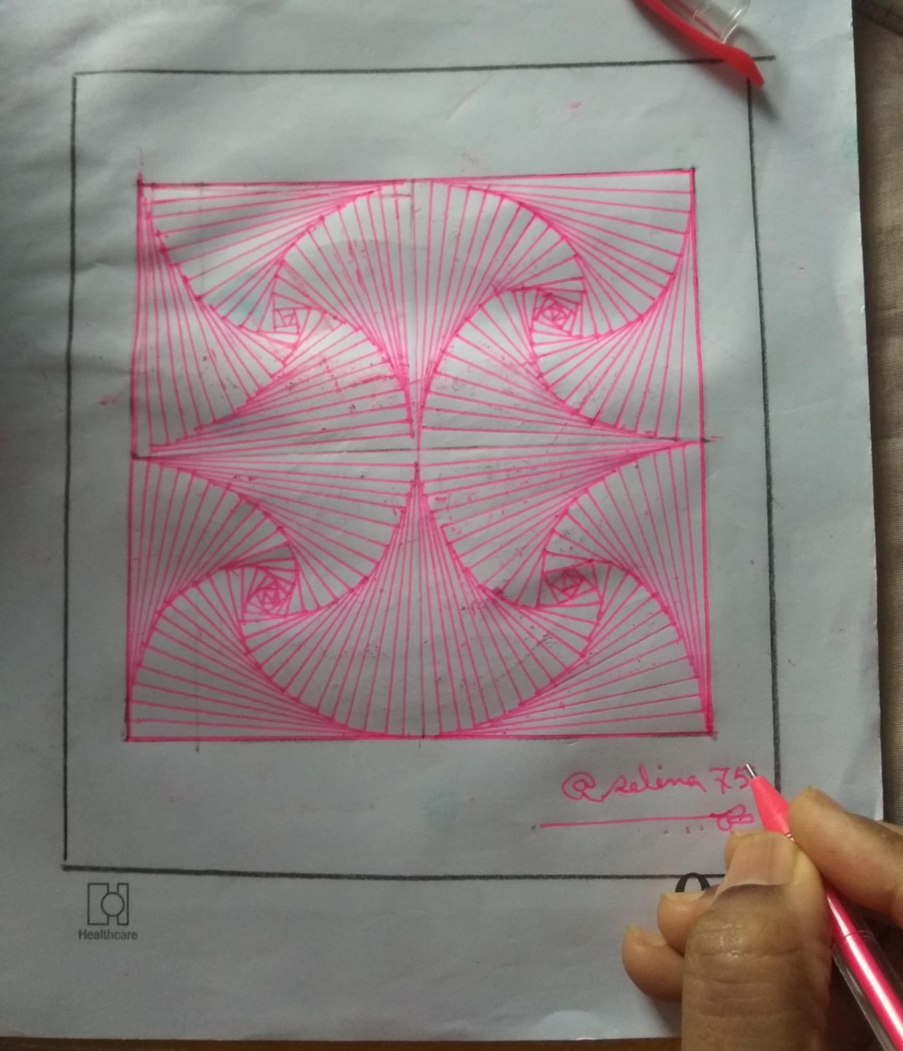 গোলাপী রং এর জেল পেন দিয়ে একটি বর্গক্ষেত্র স্কেলের সাহায্যে দাগ টেনে টেনে ভরাট করে নিয়েছি।
