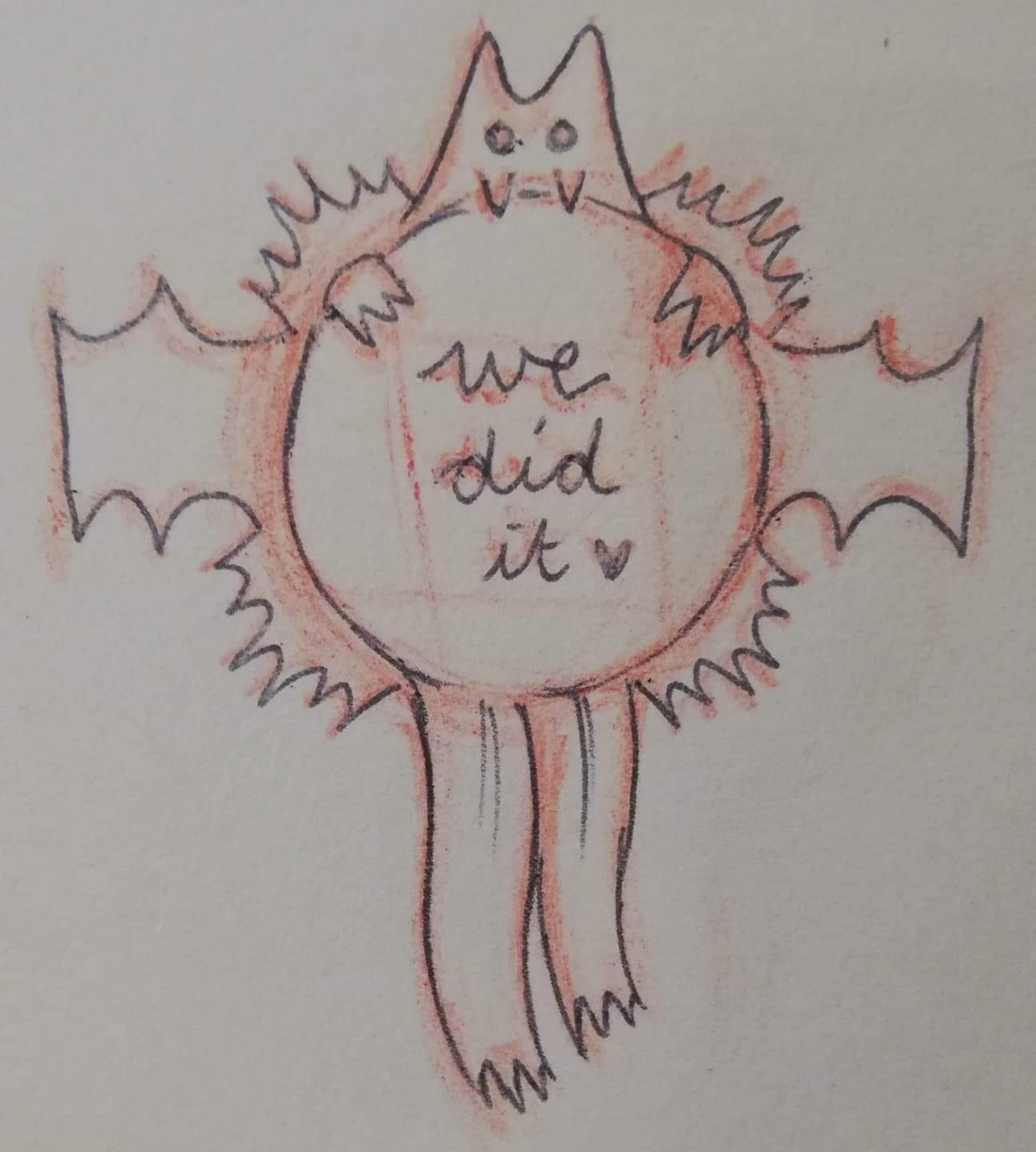 Here is the original sketch on paper! I thought making the loose ribbon into little legs was very cute hehe, we were given a template of a regular rosette so I made sure to keep within the lines when doing the legs, head and bat wings (and the four extra tiny bats).