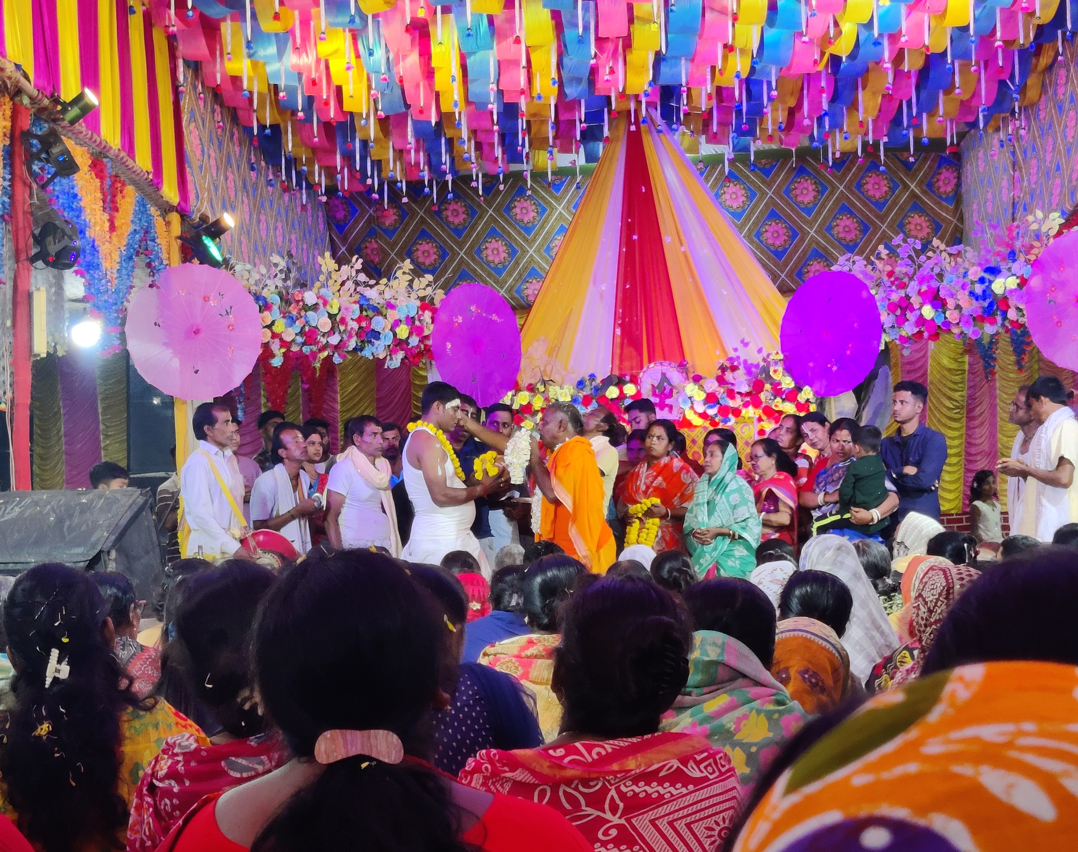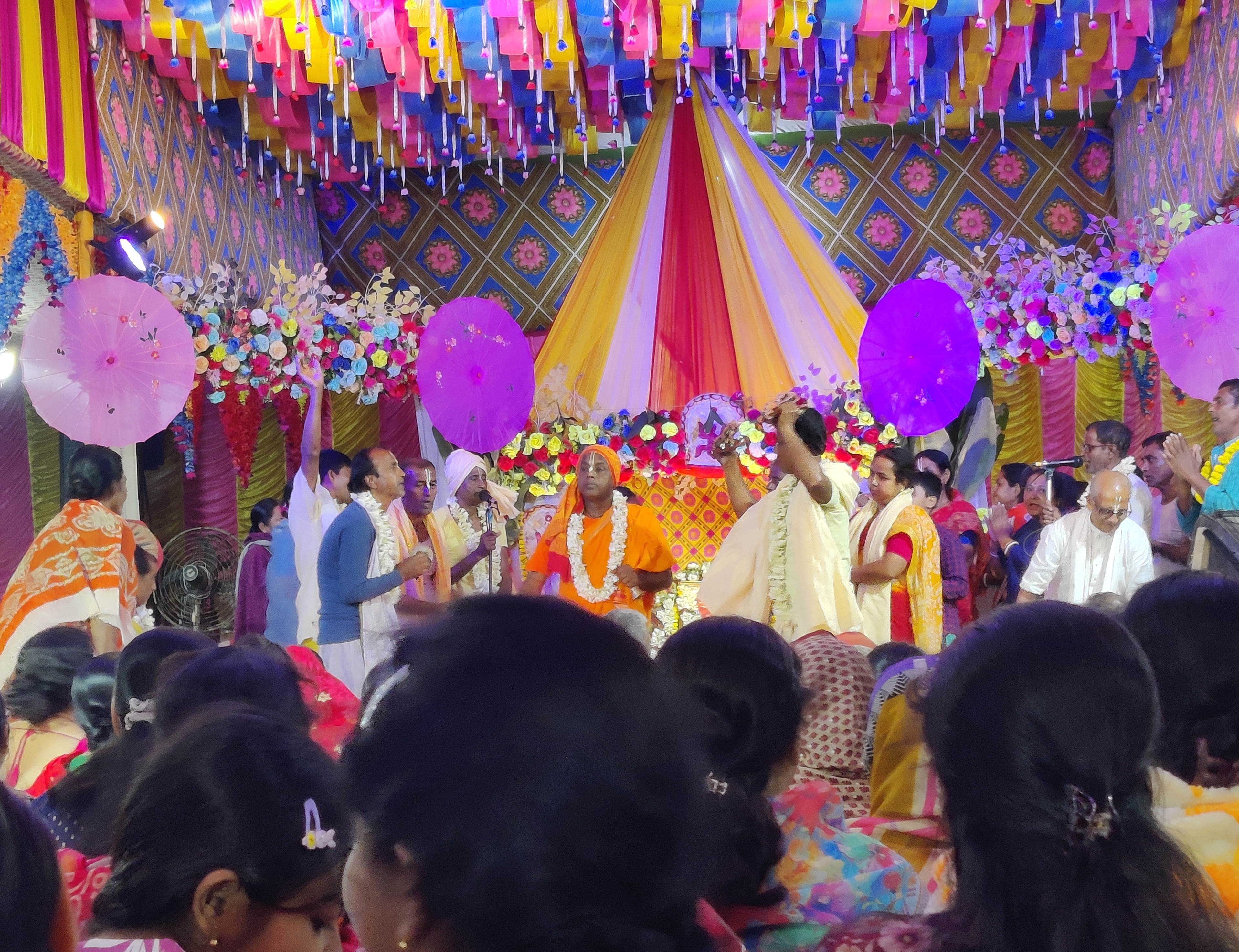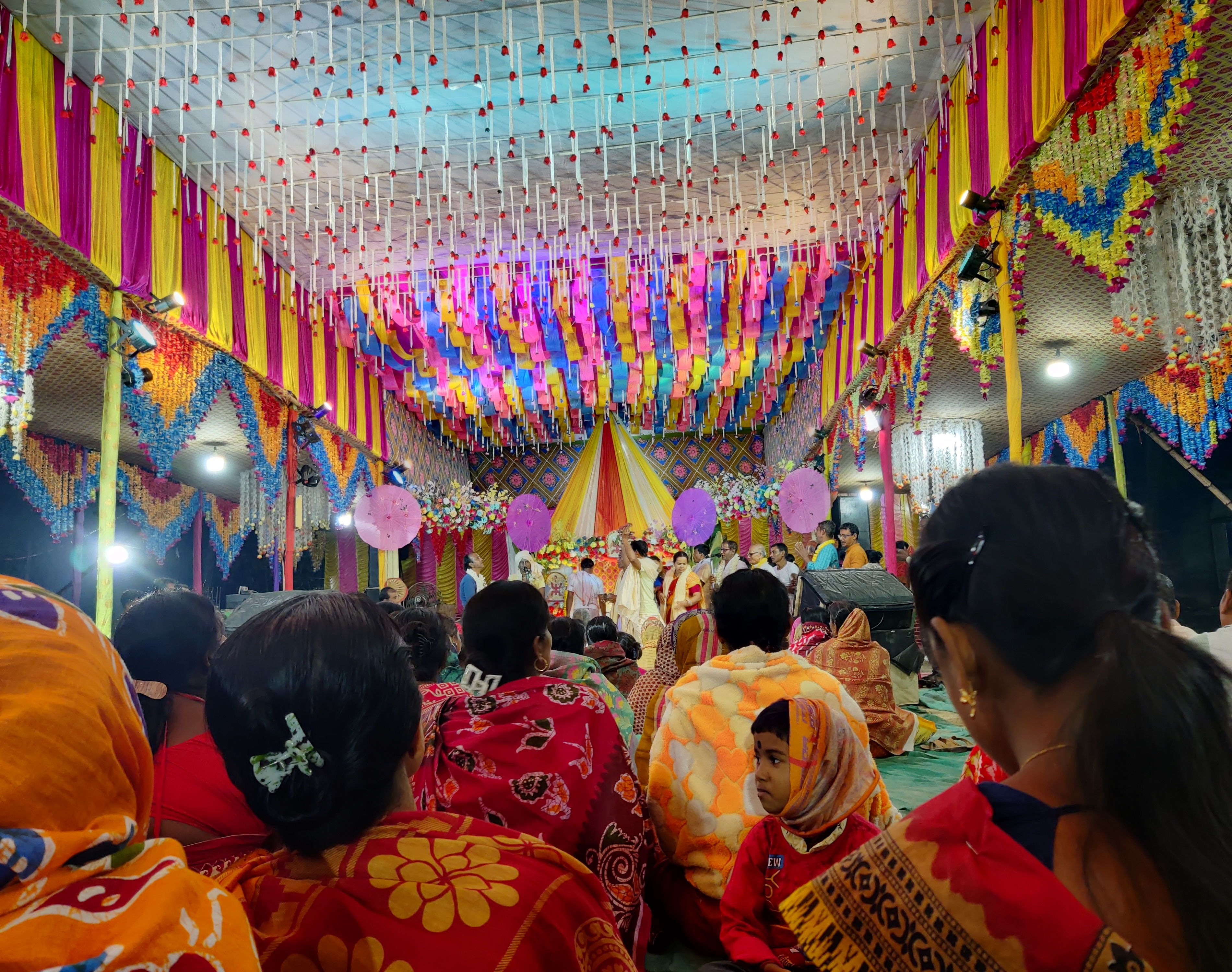 তাই আমরা তাড়াতাড়ি গিয়ে আসরের সামনে বসে পড়লাম। প্রচুর মানুষের বসার জায়গা রয়েছে সেখানে, অনেকটা জায়গা নিয়েই প্যান্ডেল তৈরি করা হয়েছিলো। মূল মন্দিরটি থেকে আমরা অনেকটাই দূরে বসে ছিলাম, যেহেতু আমাদের আগেও অনেক মানুষ পৌঁছে গিয়েছিলো, তারাই সামনের দিকে বসেছিলো।
