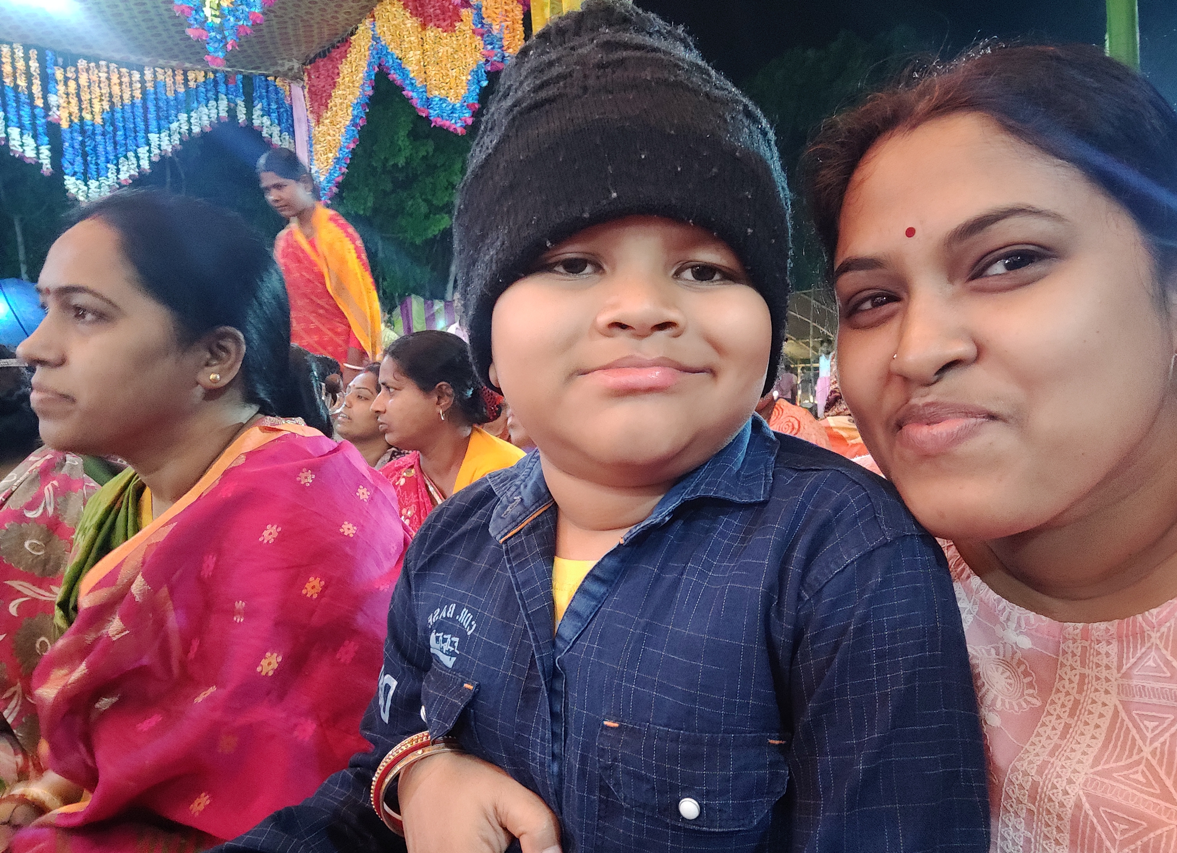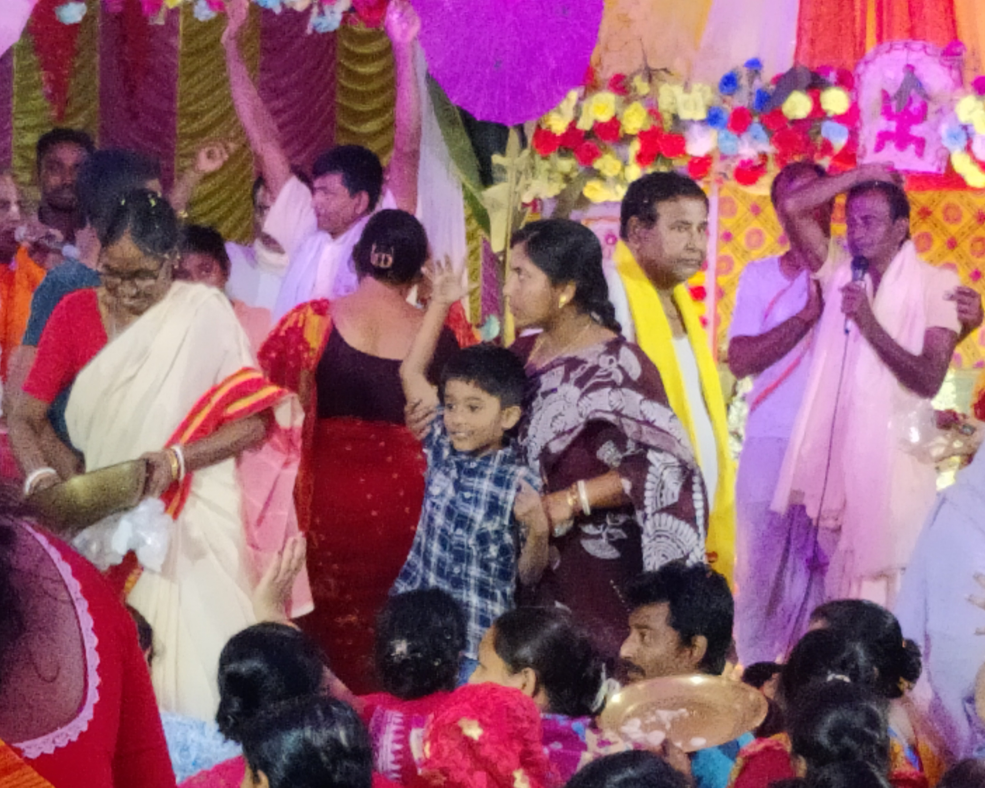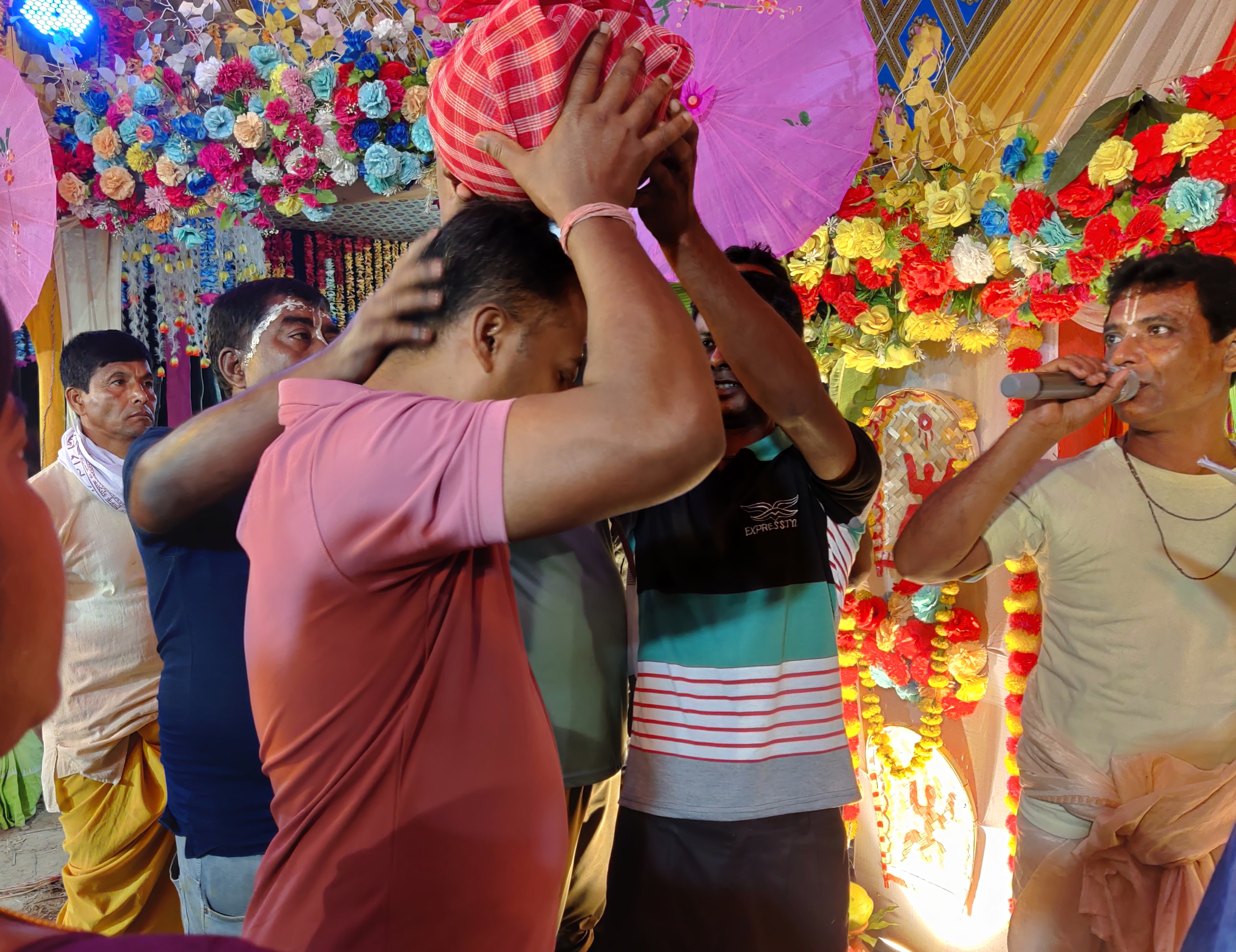 তাই আমরা তাড়াতাড়ি গিয়ে আসরের সামনে বসে পড়লাম। প্রচুর মানুষের বসার জায়গা রয়েছে সেখানে, অনেকটা জায়গা নিয়েই প্যান্ডেল তৈরি করা হয়েছিলো। মূল মন্দিরটি থেকে আমরা অনেকটাই দূরে বসে ছিলাম, যেহেতু আমাদের আগেও অনেক মানুষ পৌঁছে গিয়েছিলো, তারাই সামনের দিকে বসেছিলো।