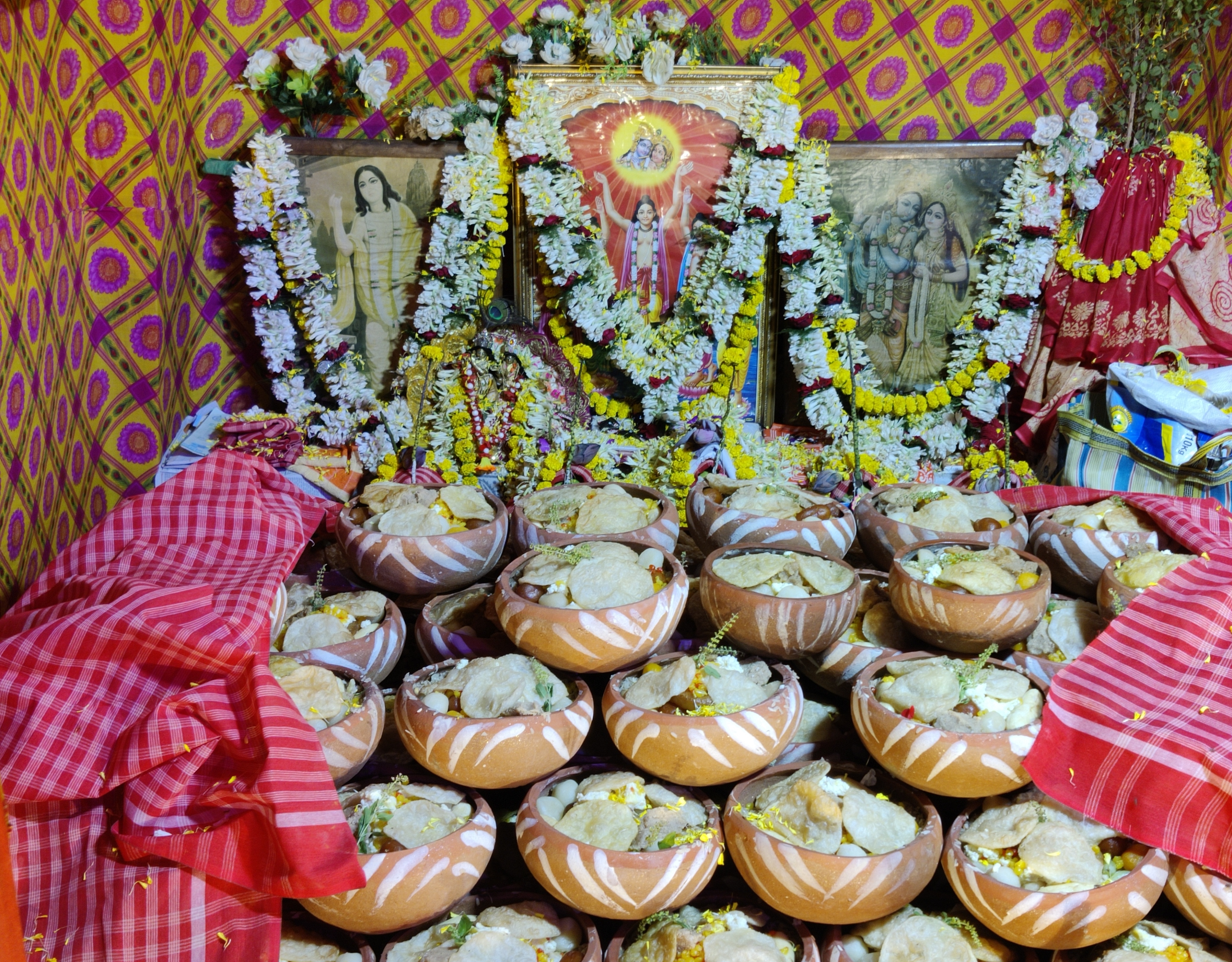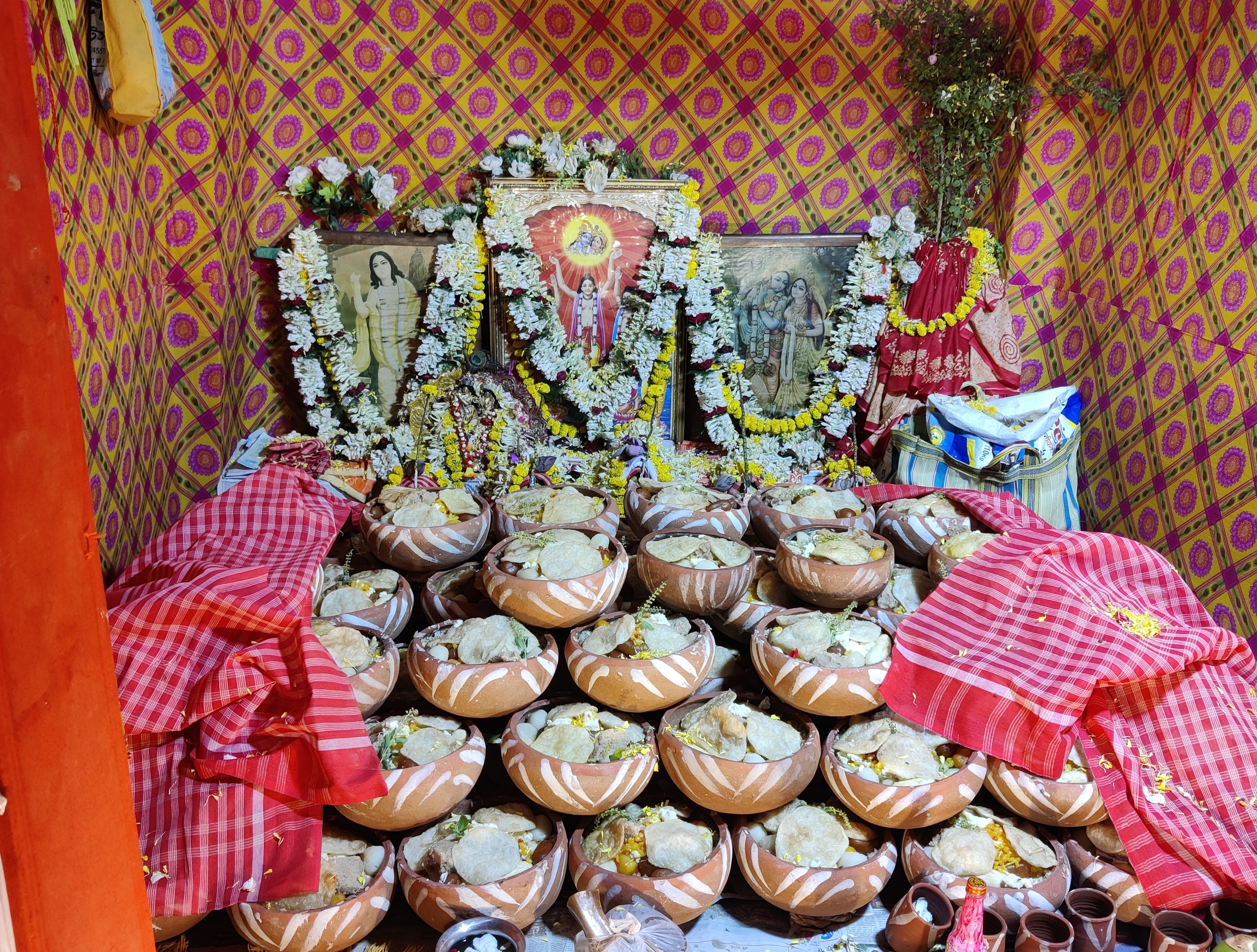 মালসা ভোগের একটা বিষয় দেখে আমি অবাক হলাম, সমস্ত মালসার মধ্যে একটা করে তুলসীর মঞ্জুরী দেওয়া হয়েছিলো। এরপর একটার উপর আরেকটা মালসা সুন্দরভাবে সাজিয়ে ঠাকুরের সামনে রাখা হয়েছিলো।