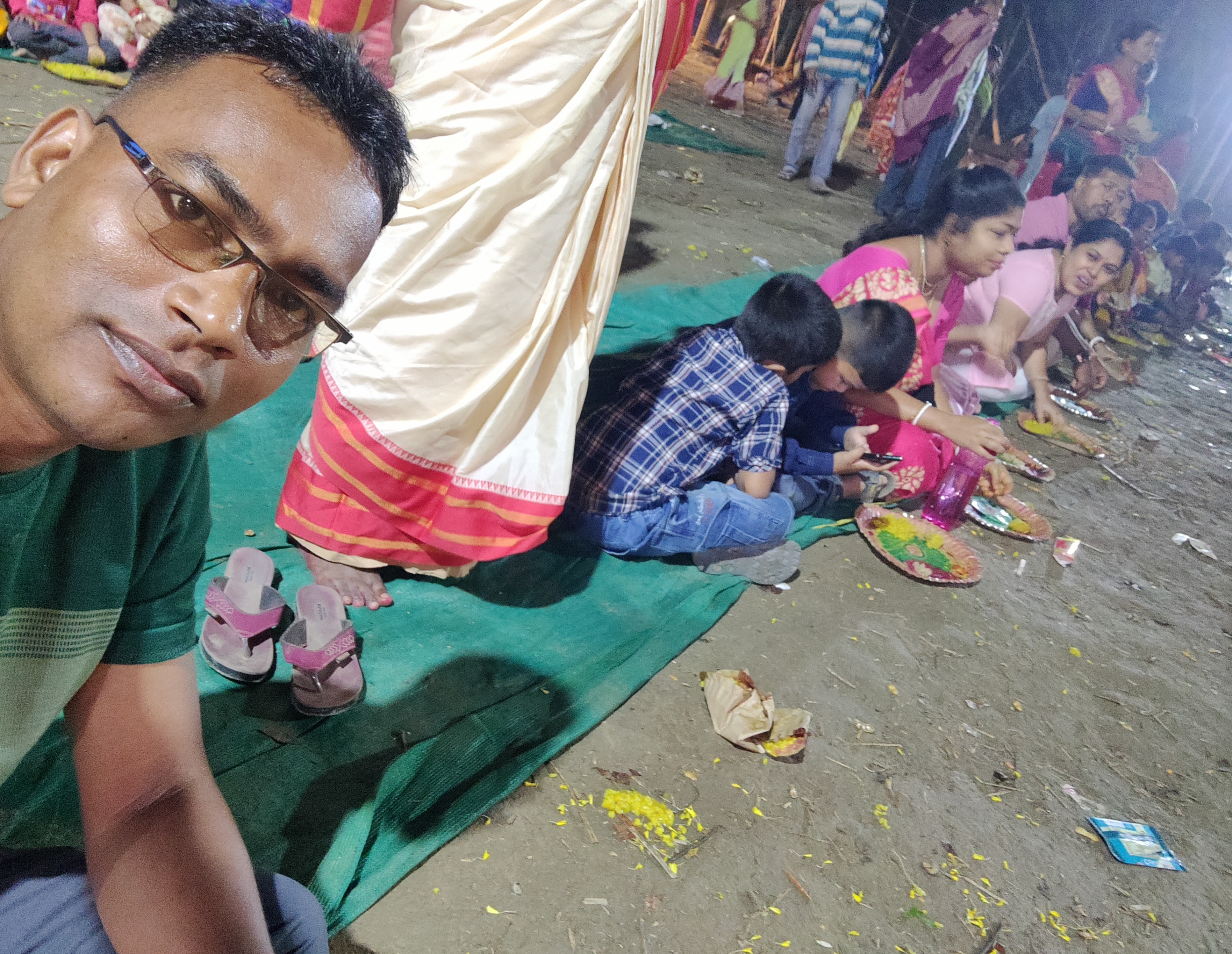 অসাধারণ একটা সময় কেটেছে সেখানে। এই মুহূর্ত গুলোর অনুভূতির শব্দের মাধ্যমে ব্যাখ্যা করা আসলেই অসম্ভব। যাইহোক এখানে যারা কর্মকর্তা ছিলেন তারা সকল গ্রামবাসীদের জন্য খিচুড়ি প্রসাদেরও আয়োজন করেছিলেন। তাই ভোগ আরতি শেষ হওয়ার পরে সকলের জন্য একসাথেই মাঠের মধ্যে খাবার দেওয়ার আয়োজন করেছিলেন। আমরাও আর দেরি না করে সেখানে বসে পড়েছিলাম খিচুড়ি ভোগ খাওয়ার জন্য।