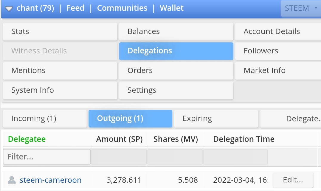 ![]() Delegations | steem-Cameroon(3,278.489sp) |