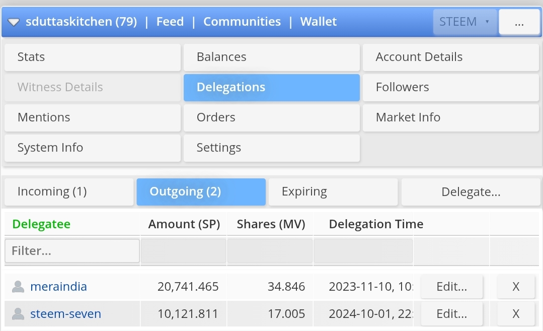 ![]() Delegations | 1.meraindial(20,740.706sp), 2.steem-seven(10,121.441sp) |