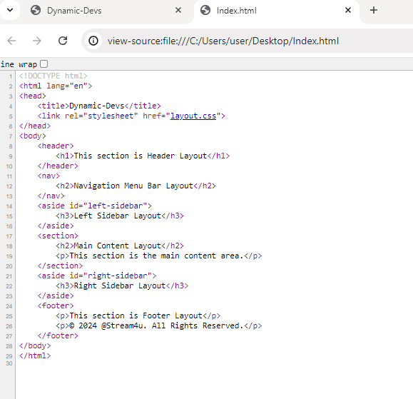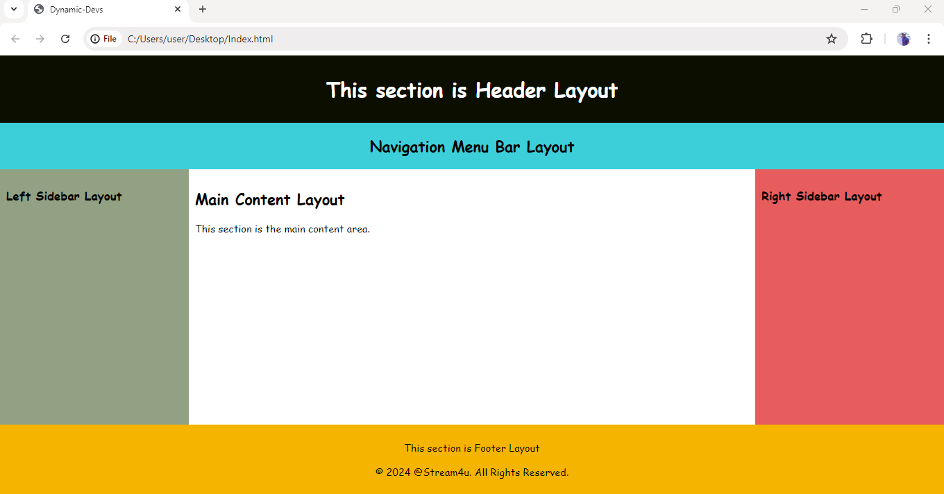 Below is the screenshot of the developed a completed Web Page in the browser including layouts Header, Navigation bar, Main Content Section, Left Sidebar Layout. Right Sidebar Layout, and Footer Layout.