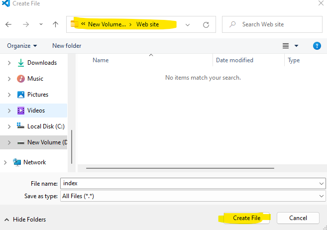 4️⃣ Select the location where you want to keep the file "Index.html" and click to "Create File".