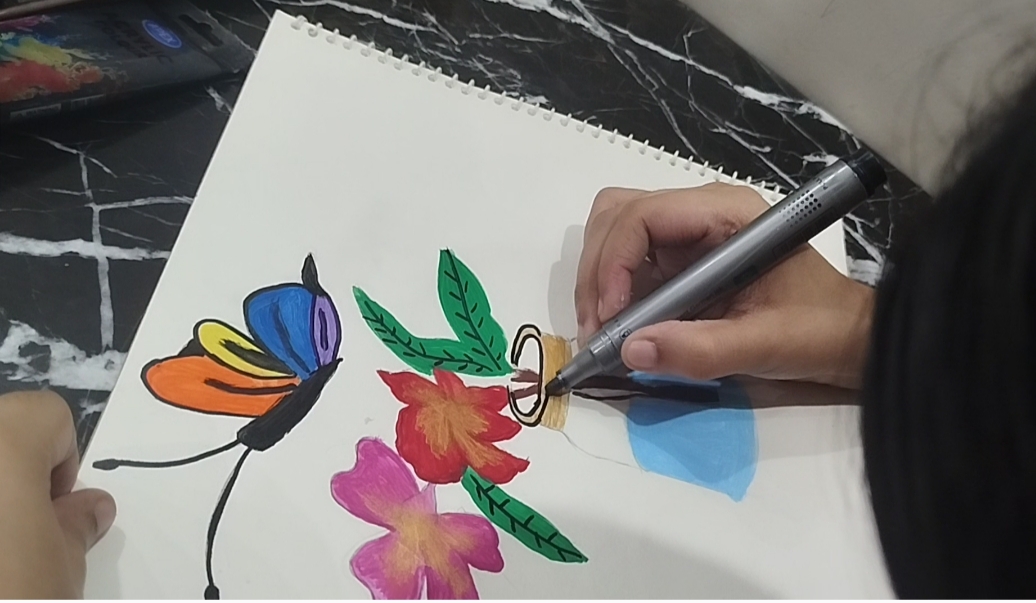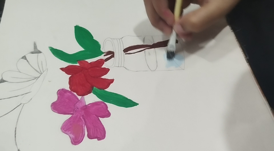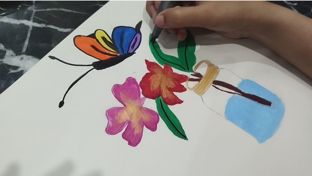 - I give pink and red colors to flowers and green levers with brown sticks.Filled different beautiful colours in butterfly 🦋and sky blue in the jar .