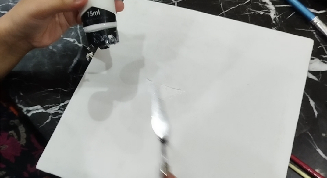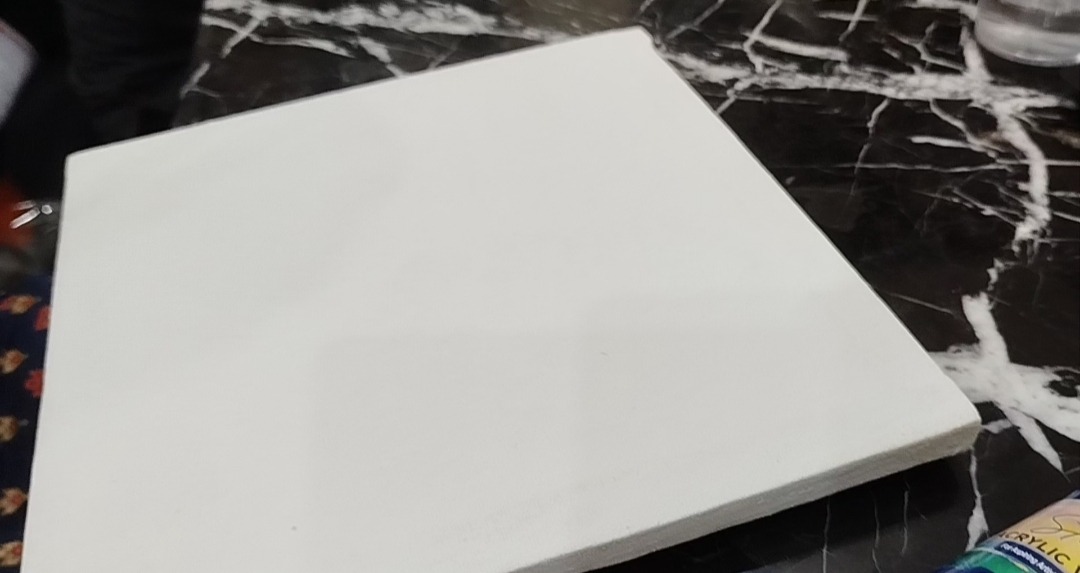 For canvas painting we need canvas first I used 8" by 8" size it's optional you can use any size you like ,by first I put white paint on the center of the canvas .
