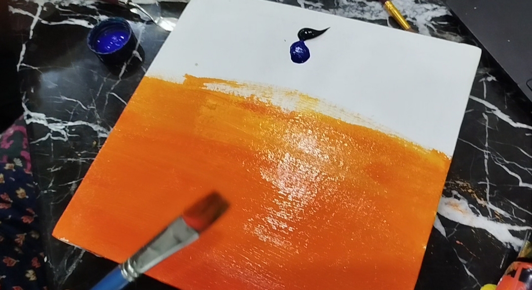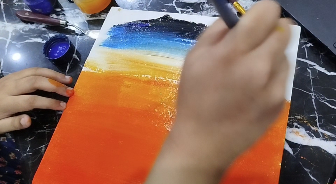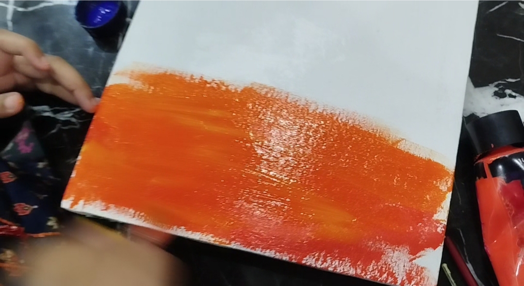 I wants to paint sun set so we need orange and yellow for darker side dark blue .So I spread the orange colour first by free strokes from brush.