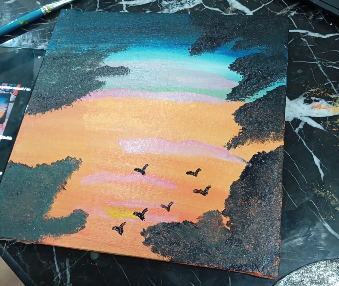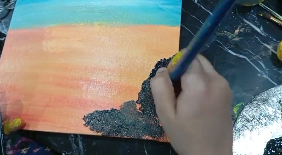 When canvas were completely dried now starting details that I thought for more ,I used black acrylic paint for free bushes .At this time the sun light dim and the tree looking black.due to darkness so.used black it's choice you can also used green colour as well
