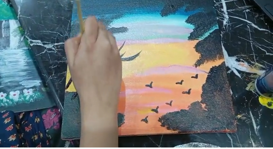 Now I blend the pink shade in middle are and done my tree bushes then drew few birds from fine tip brush with black shade .