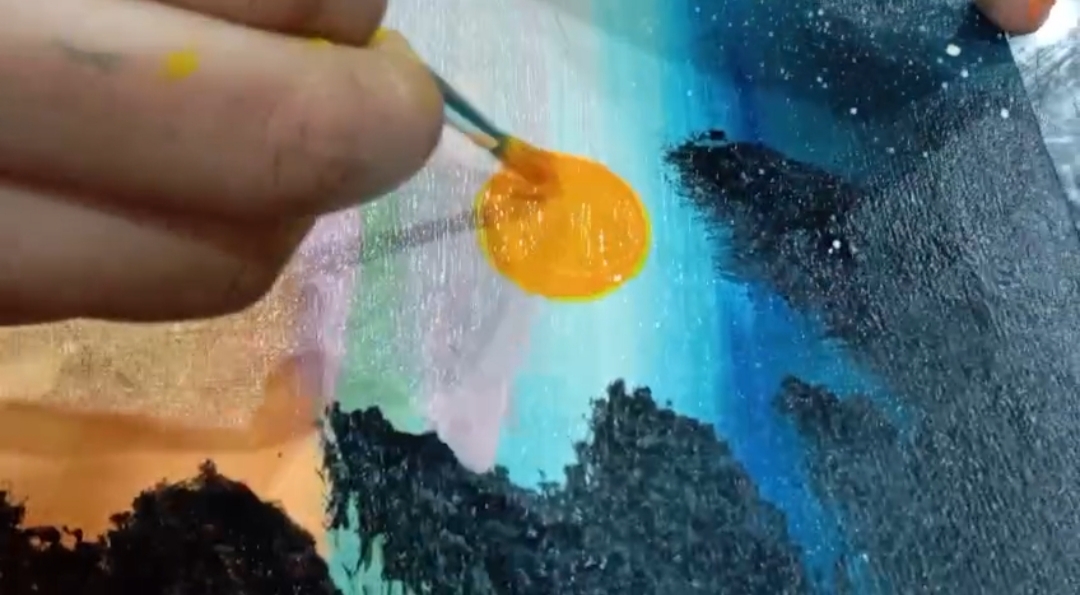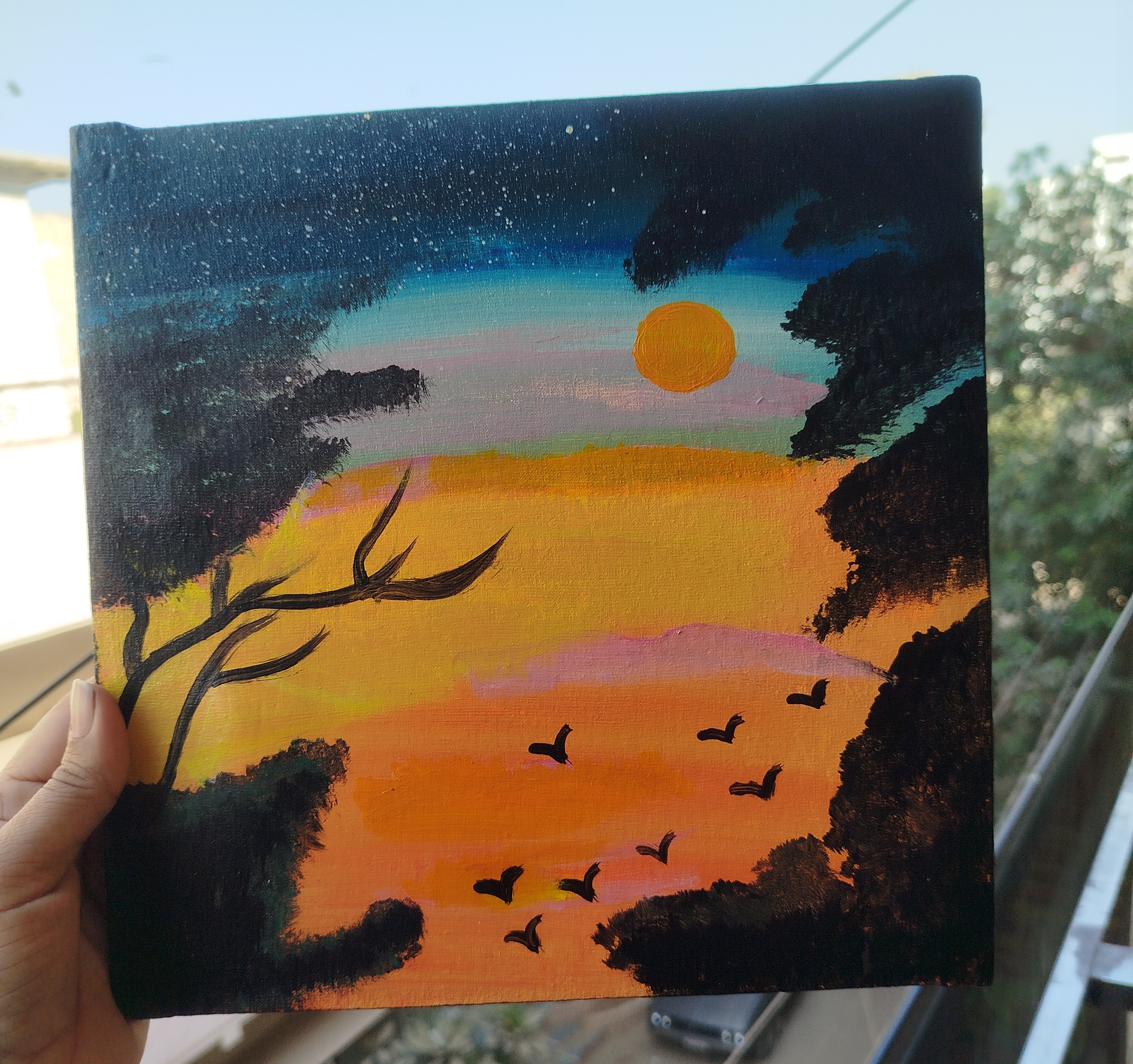 The painting were completed,at the end I painted the small sun having deep yellow shade that shown the sun set have been started .