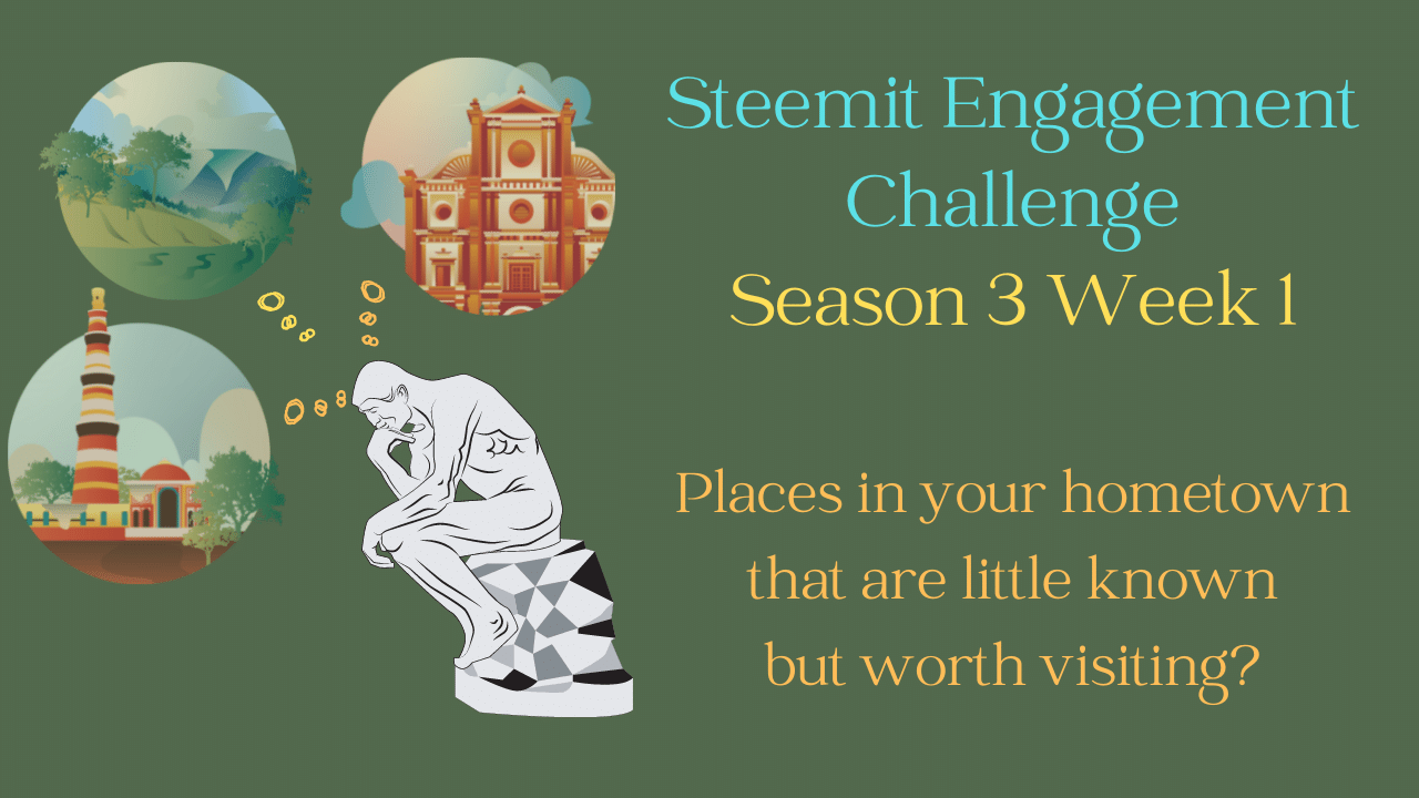 - The post’s title must be: “Steemit Engagement Challenge S3W1 - Which places in your hometown are little known but worth visiting by @username”