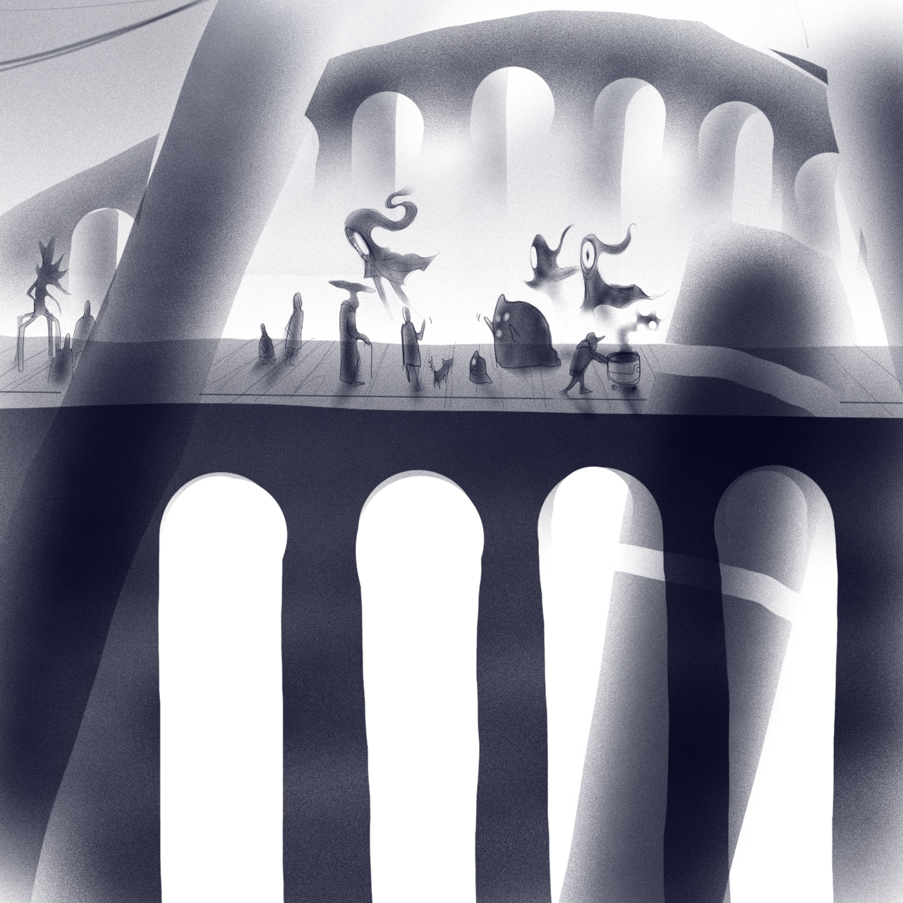 Inktober 19uly128 (48)in #inktober • 8 years ago The spiral stair opens into vast room. Metal sky with spotlight stars, Giant pipedream trees, Webs of wire. Creatures stroll along the paths. #art #drawing #creativity #story