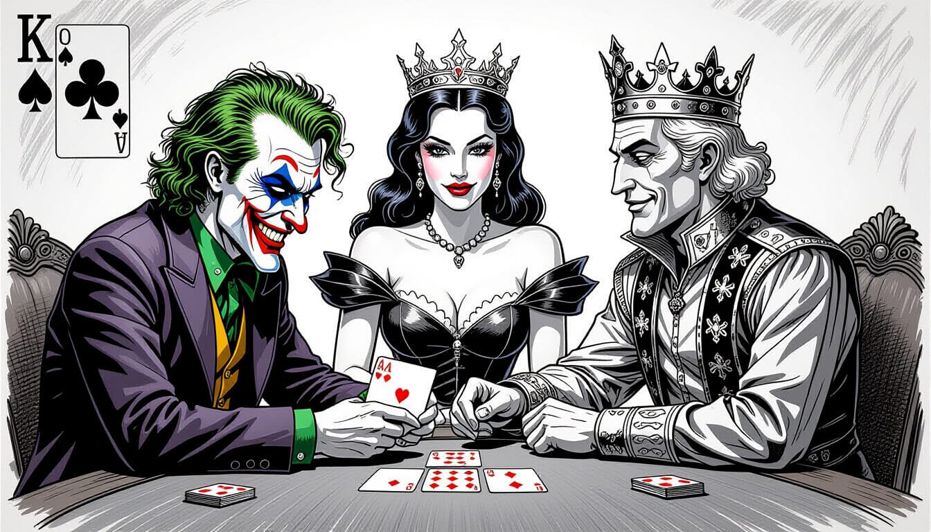 The Inktober Prompt for October 18 is "Deal." I imagined a joker dealing cards to a King and Queen; So, I asked Night Cafe to generate the #ai-image above. That joker appears to be palming two aces.