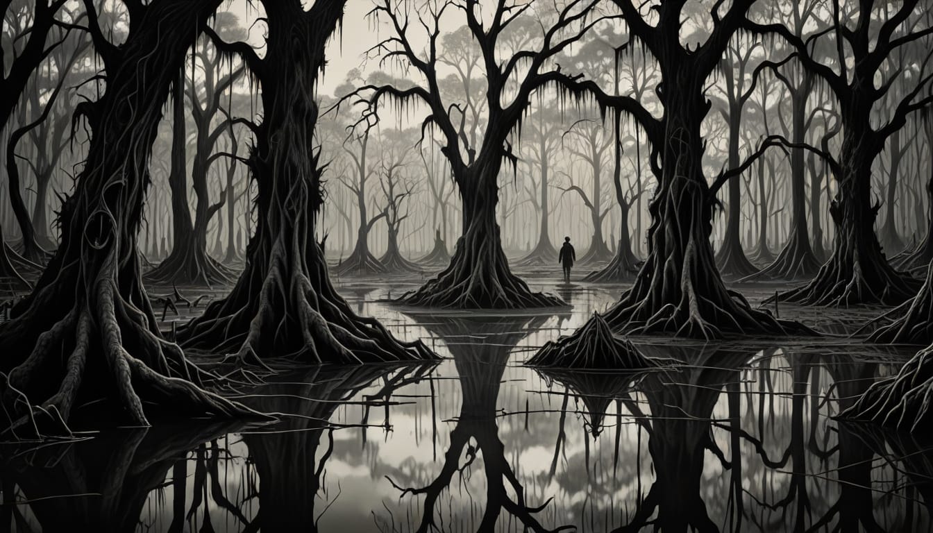 Day 4 of #inktober is coming to an end. The prompt for the day was "murky." Since I don't have time to draw a picture, I generated an drawing of a person walking through the bayou