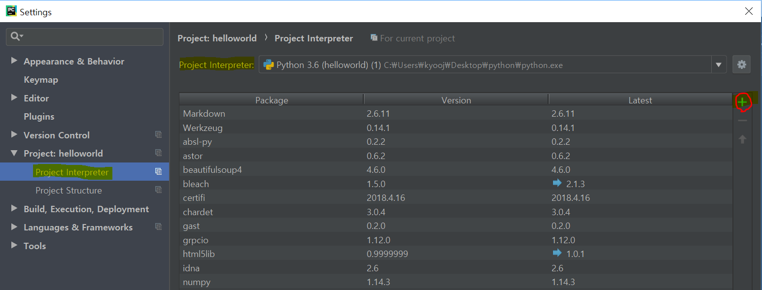 Select 'Project interpreter' > Check the directory of 'Project interpreter' . Directory where Python originally is installed, ending with python.exe > And then Select '+'