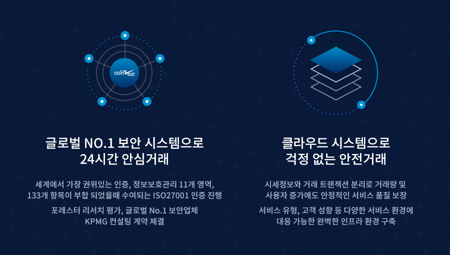또한, 여러분께서도 익히 아시다시피 원화 입/출금이 가능한 거래소입니다. 보안 역시 매우 중요한 요소인데요, 코인제스트 측에 따르면 코인제스트는 ISO27001 인증 (세계에서 가장 권위있는 인증) 진행 중이며 세계 4개 종합서비스기업 중 하나인 KPMG 와의 컨설팅 계약이 체곌되어 있습니다. 또한 완벽한 인프라 구축을 통해 위험 요소에 대한 대비가 완벽히 구축되어 있습니다.
