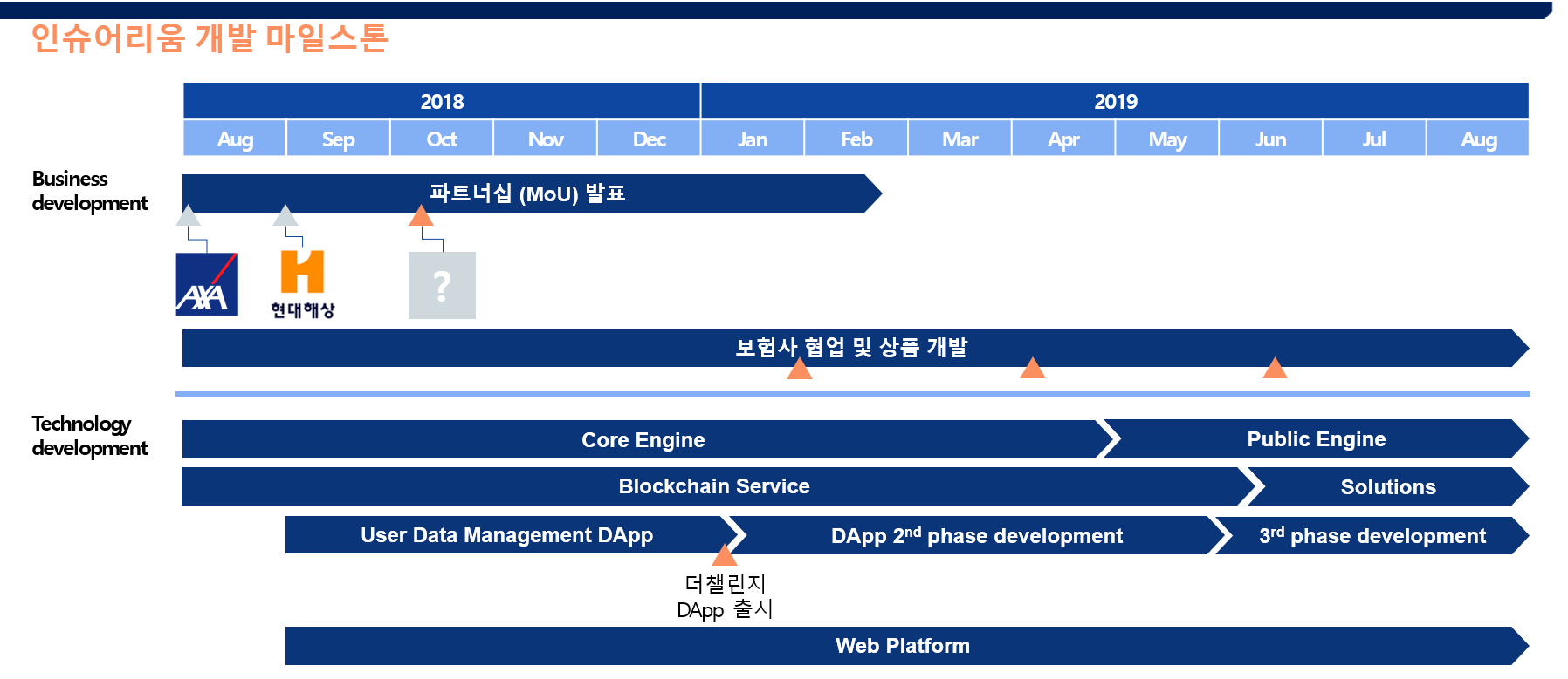 지난 번 안내 드린 것처럼, 인슈어리움은 현재 다양한 보험사 및 써드파티와 협업하며 실제로 활용 가능한 상품을 개발, 런칭하기 위해 노력하고 있습니다. 이미 AXA 및 현대해상화재와 업무협약을 맺고 블록체인 보험상품을 개발 중에 있으며, 올해 중으로 1-2개의 추가 파트너십 발표를 앞두고 있습니다.
