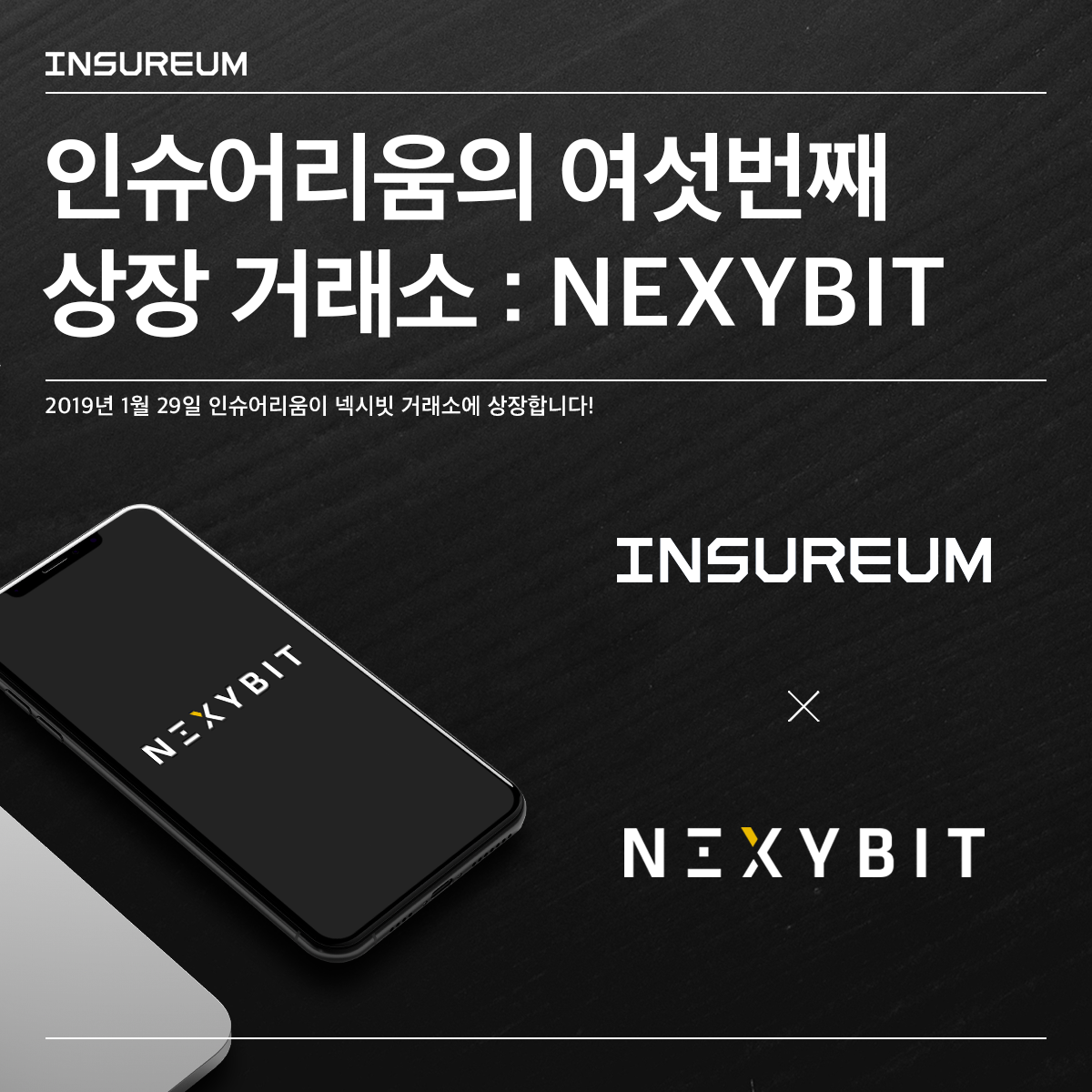 이와 같이 다양한 장점을 가진 Nexybit(넥시빗)에 인슈어리움을 상장함으로써 더욱 많은 분들께 보다 쉽고 가깝게 다가갈 수 있을 거라 믿습니다. 상장은 1월 29일 (화요일) 에 이뤄질 예정이며, 정확한 상장 시간은 가까운 시일 내에 공개하도록 하겠습니다. 재미있는 상장 기념 이벤트도 함께 진행할 예정이니, 주목해주세요!