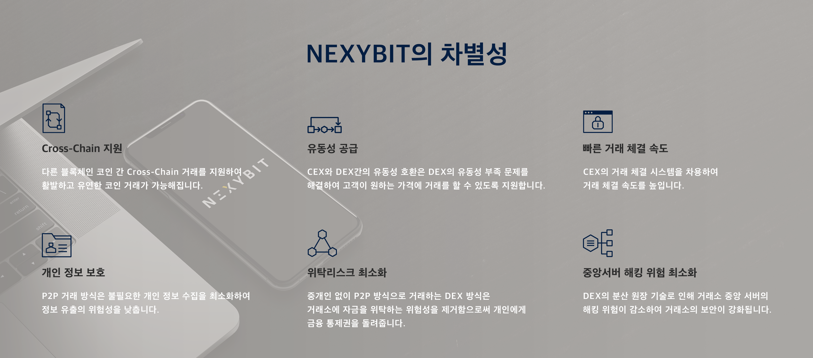 넥시빗은 중앙화 및 탈중앙화 설계의 강점을 통합하여 구현된 하이브리드 모델 기반의 글로벌 암호화폐 거래소입니다. 새로운 Nexy DEX 모델은 거래소의 보안과 속도 문제를 동시에 해결합니다.