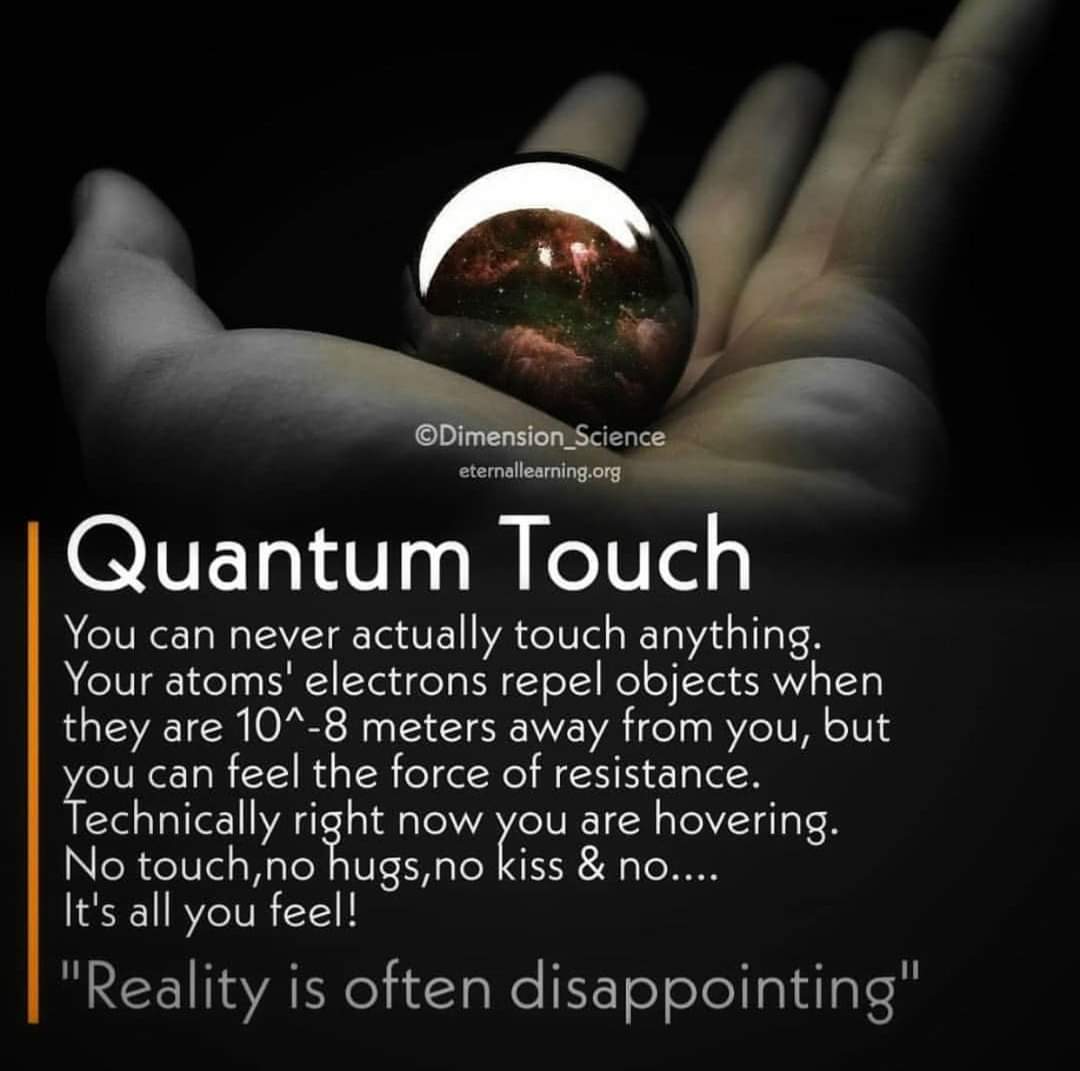 You can never actually touch anything. your atom's electrons repel objects when they are 10^-8 meters away from you, but you can feel force of resistance. Technincally right now you are hovering. No touch, No hungs, No kiss no love. its just our feelings.