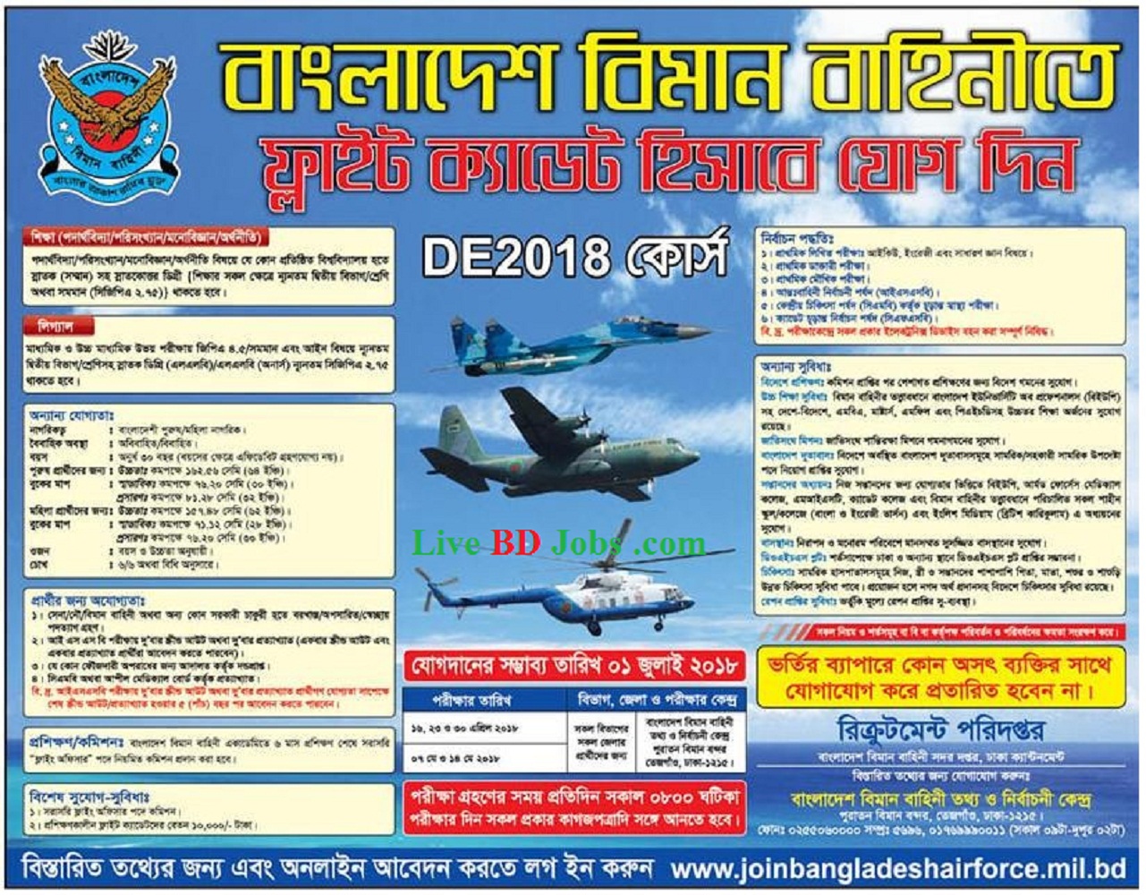 বাংলাদেশ বিমান বাহিনী নিয়োগ বিজ্ঞপ্তি ২০১৮ দৈনিক অনলাইন জব পোর্টাল এ প্রকাশিত হয়েছে। এচাড়াও লাইভ বিডি জবস www.livebdjobs.comlink ওয়েবসাইট থেকেও পাওয়া যায়। বাংলাদেশ এয়ার ফোর্স বাংলাদেশের আরিয়াল ওয়ারফেয়ার শাখা। বাংলাদেশের সশস্ত্র বাহিনী প্রধানত বাংলাদেশ ভূখণ্ডের বায়ু প্রতিরক্ষার সাথে নিযুক্ত করে এবং বাংলাদেশকে বায়ু সরবরাহ প্রদান করে। বাংলাদেশ বিমান বাহিনী প্রধান থিম আকাশ রক্ষীবন্ধ মুক্ত ভাল খবর সম্প্রতি বাংলাদেশ বিমান বাহিনীকে নতুন নতুন ক্যাডেট দেখানো হয়েছে।