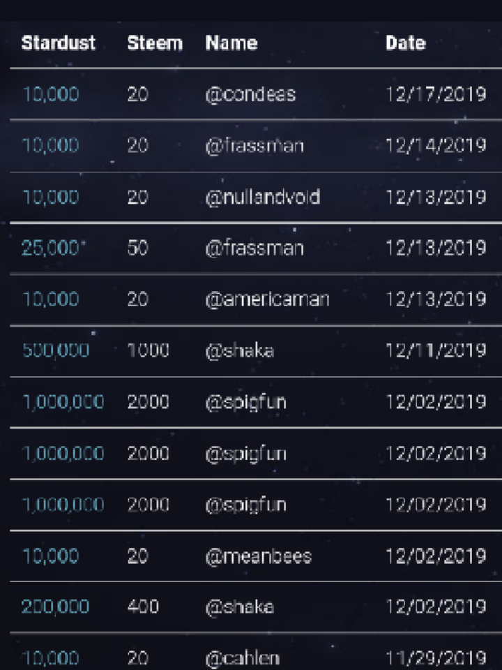 It is also interesting to know how vibrant the NextColony gaming was, a lot of great gamers purchased more Stardust in stock, after all, they can convert them back to liquid steem. That makes Stardust valuable to maintain its image. Some were having as much as 1,000,000, 500,000 and 10,000 Stardust in the capacity to influence the gaming and to build more empire in this NextColong gaming. For instance, @spigfun was having 1000,000 Stardust, @shaka was having 500,000 Stardust and @condeas having 10000 Stardust. Several individuals gamers were equally having more stock in their Stardust wallet , and that were credit to their efforts in the NextColony Game.