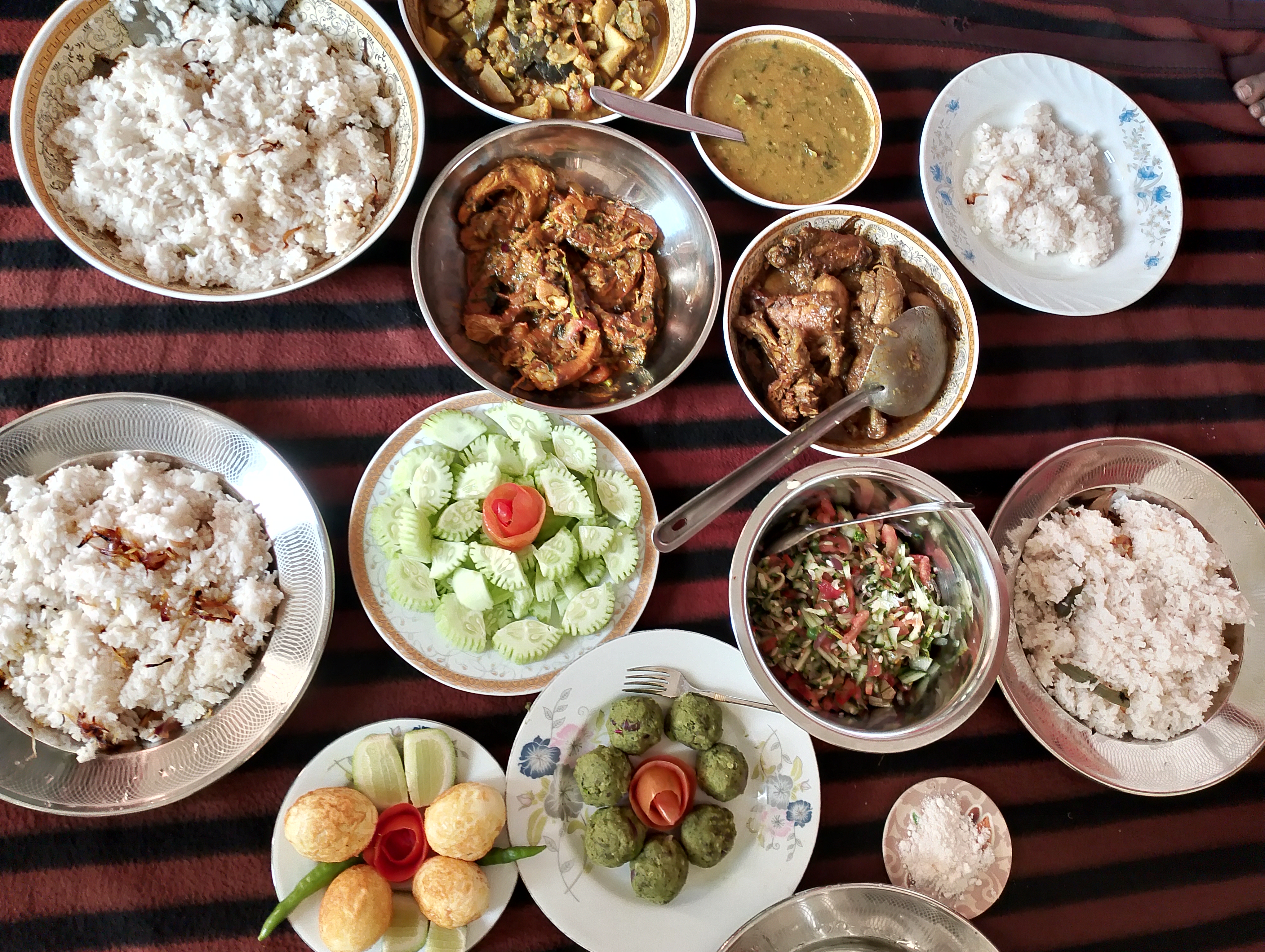আইটেমগুলোর মধ্যে রয়েছে টাকি মাছের ভর্তা, সবজি, কারফু মাছ ভুনা,ডিম ভুনা, দেশি মুরগি ভুনা, ডাউলের চচ্চড়ি আর রয়েছে আমার সবথেকে প্রিয় জিনিস দুই প্রকারের সালাদ। তাছাড়া আরো দুইটি আইটেম তারা করতে চেয়েছিল কিন্তু তাদের বাসায় গ্যাসের প্রবলেম থাকার কারণে সেটা করতে পারেনি। যাইহোক আমাদের রিজিকে যতটুকু ছিল ততটুকু আমরা খেতে পেরেছি। খাবারের স্বাদ অতুলনীয় ছিল, বিশেষ করে সবজি আর ডাউলের চচ্চড়িটা খুবই সুস্বাদু হয়েছে। যার ফলে এই দুইটা আইটেম আমি দুইবার করে নিয়েছিলাম।