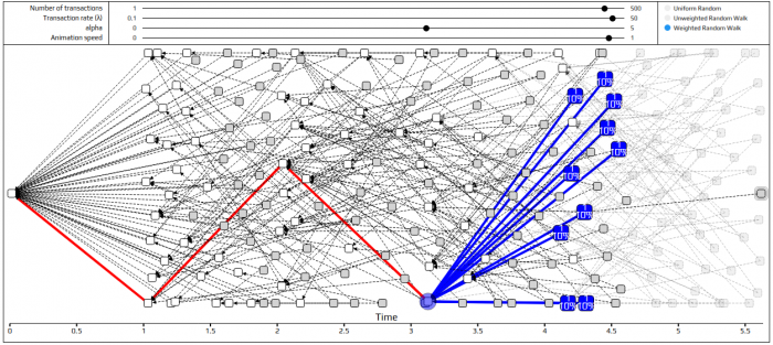 A simulation of the tangle, given parameters of the number of transactions, the rate at which they arrive, the degree of randomness, and the type of random walk used for connecting incoming transactions from genesis to tip.