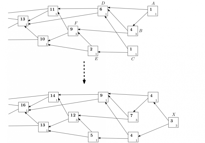 A DAG with weight assignments before and after a newly issued transaction, X. The boxes represent transactions, the small number in the corners of each box denotes own weight, and the bold number on top denotes the cumulative weight. Source: IOTA white paper.