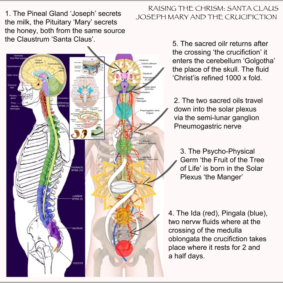 The Santa Claus story of going up and down the chimneys delivering presents is the metaphor of the Christ oil production and use in the body. Just got lost in translation. Besides the point is that these inner workings of the human body the ancients knew somehow and have expressed it in their terms, in different cultures and traditions, but the basic truth is the same.