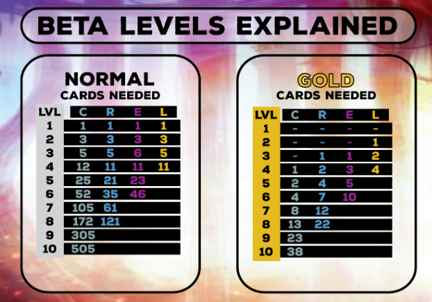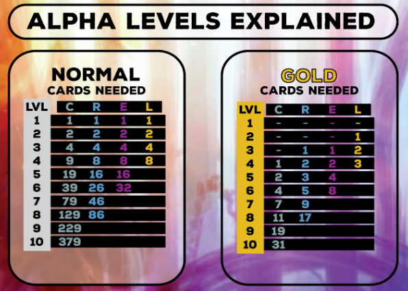 Nelle ultime due immagini potete notare la dicitura alpha e beta. Alpha è la prima serie uscita, mentre beta è l'attuale in corso. I pacchetti di alpha sono esauriti e non esistono più, invece quelli di beta sono ancora acquistabili. Vi ho mostrato entrambe le tabelle perché è opportuno conoscere la differenza. Le carte di alpha costano di più ma ci vuole di meno per livellare le carte, mentre quelle di beta costano meno, ma ci vuole di più a livellare. La scelta è vostra. Ad esempio io colleziono beta, mentre @bafi cerca di farsi un mazzo alfa.