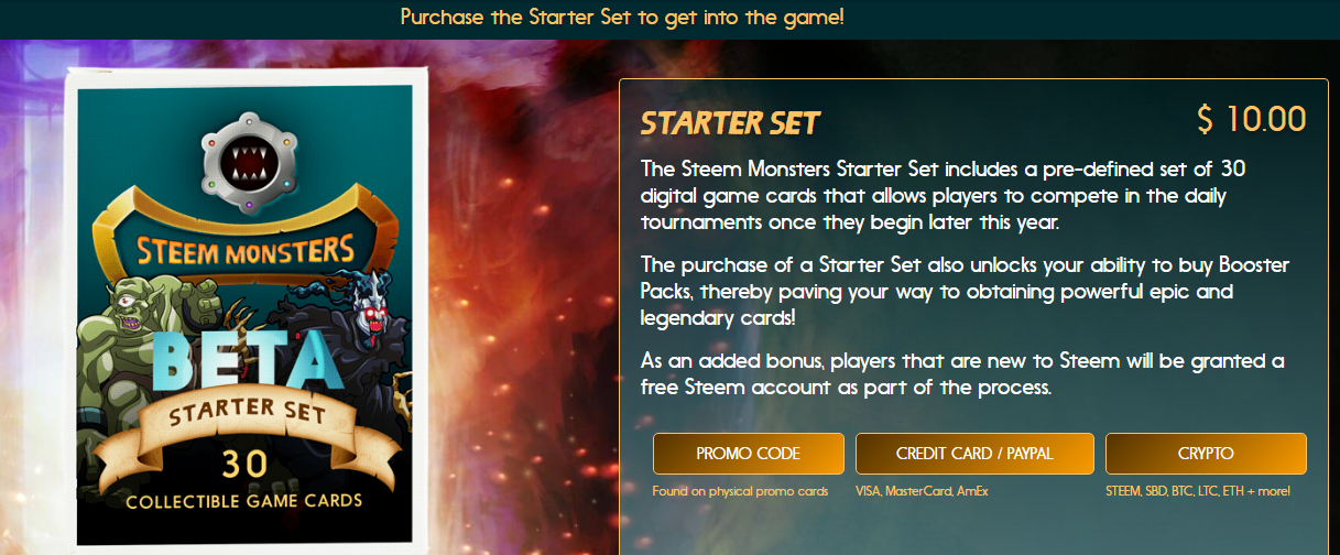 Ok, ora, entrati nella pagina, dovrete acquistare il mazzo base. Il suo costo è di 10 USD. Dollari? Ma non eravamo sulla blockchain di Steem? Se vi siete posti questa domanda, la risposta è presto detta. Gli acquisti possono essere fatti sia con le principali criptovalute, ma anche con paypal o carte di credito! Quindi anche i propri amici che non sono nel mondo delle crypto possono acquistare il mazzo base (obbligatorio) e i pacchetti che costano 2 USD cad.