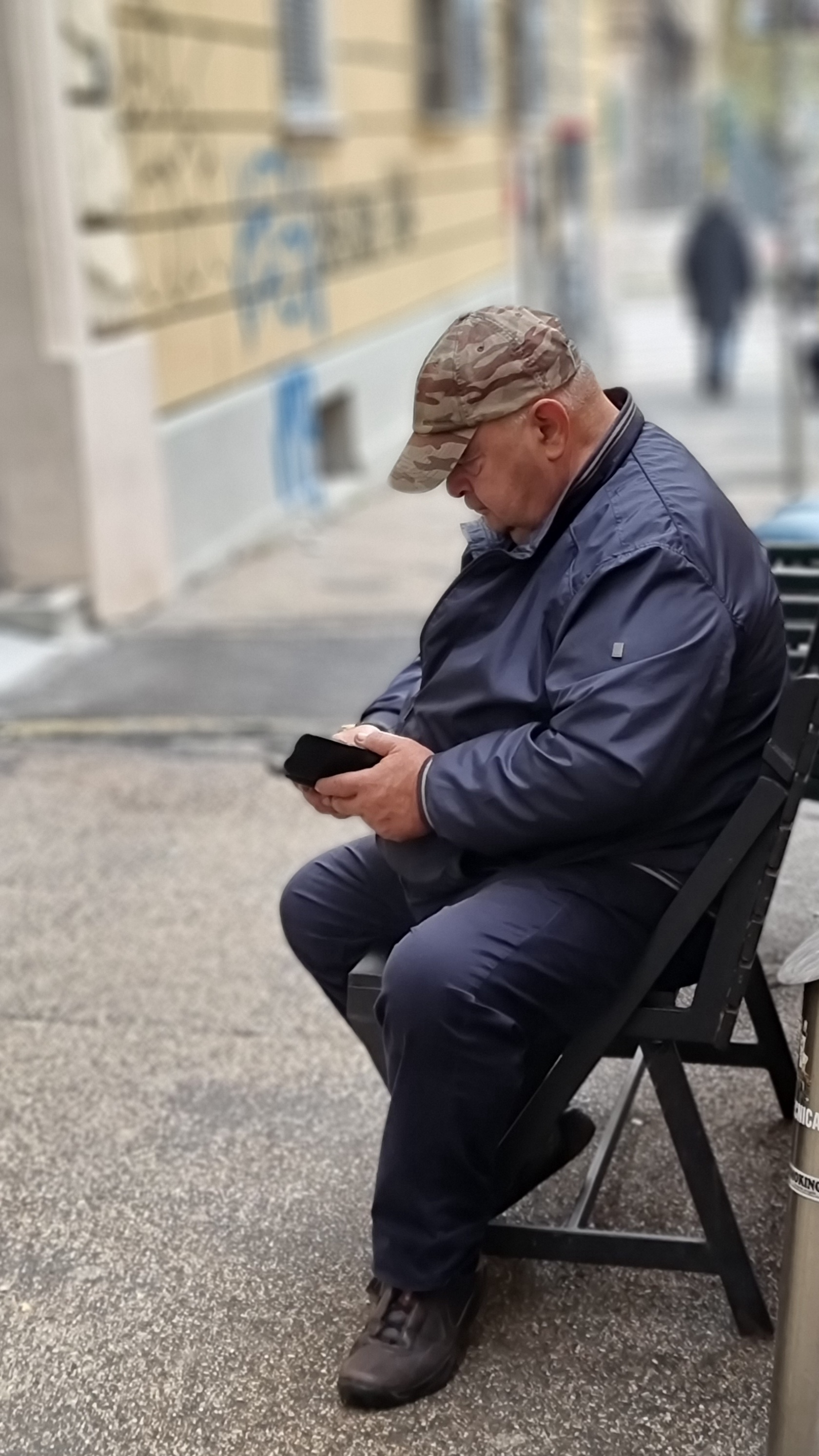 Under the warm autumn sun, the elderly gentleman silently sat on the weathered wooden bench along the dusty sidewalk. His gaze, deep and wrinkled like the bark of an old tree, was fixed on the screen of his cellphone. His knotted fingers delicately touched the glass, a connection to a digital world slowly unfolding.