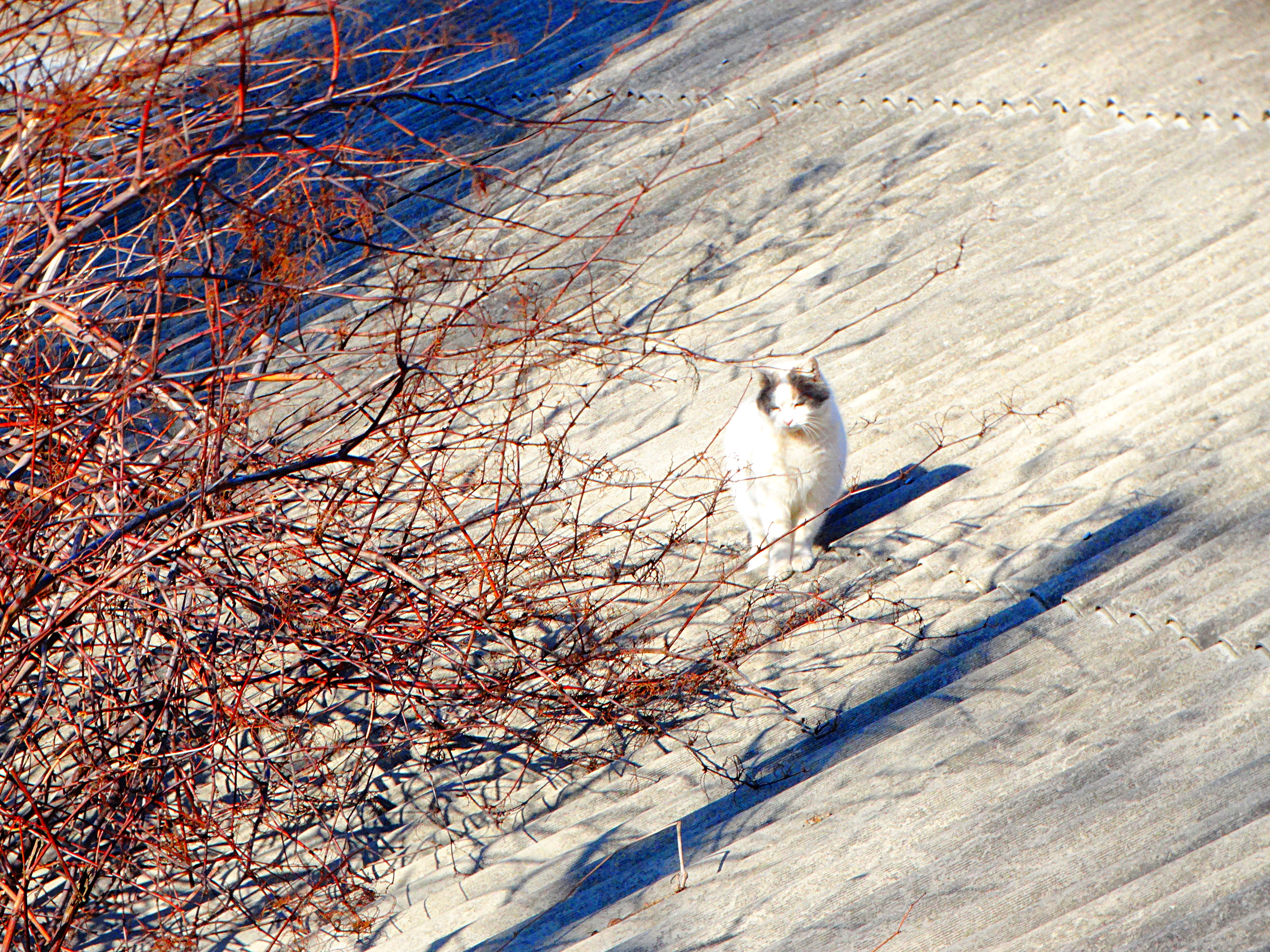 But if all the black cats decided to walk in non-sunny weather, when their shadows are blurred, then you can use the services of cats of a different color, who are not averse to basking in the sun, which is what I did, capturing a white cat with dark spots on his head, who was walking on a slate roof.