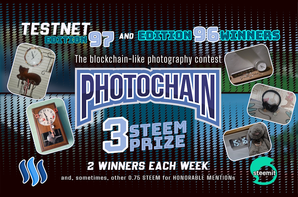 Questa è la Novantasettesima edizione della Photochain TESTNET su Steem. La Photochain Challenge è un concorso fotografico dal funzionamento di base simile a quello di una blockchain, cioè "a catena". Se vuoi saperne di più, leggi l'Edizione ZERO della Photochain TESTNET su STEEM. In quel post spiegavo il funzionamento del concorso e come poter parteciparvi.