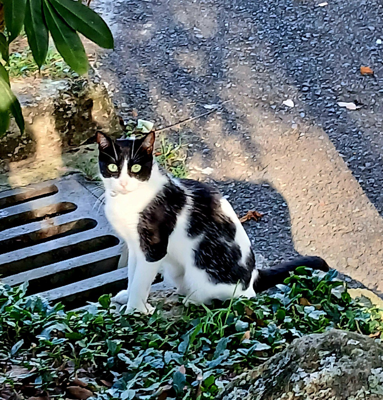 In addition to the shadow of the cat, you can see the shadows of a tree and bushes and light shadows of the waves of the slate roof in the photo.