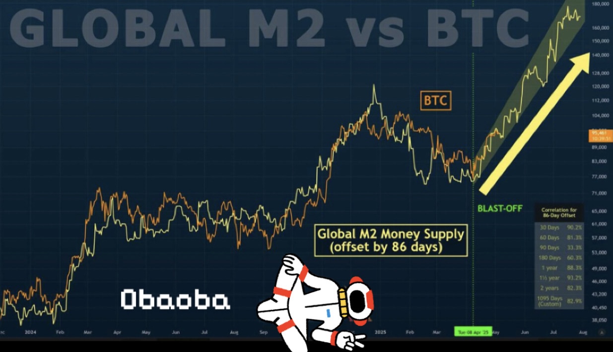 Qualche settimana fa condivisi il grafico della liquidità globale contrapposta a Bitcoin, facendo notare una certa correlazione tra i 2 grafici. Nella foto aggiornata in alto vediamo come la correlazione sia molto forte, con 86 giorni circa di ritardo del grafico di Bitcoin rispetto alla liquidità Globale.