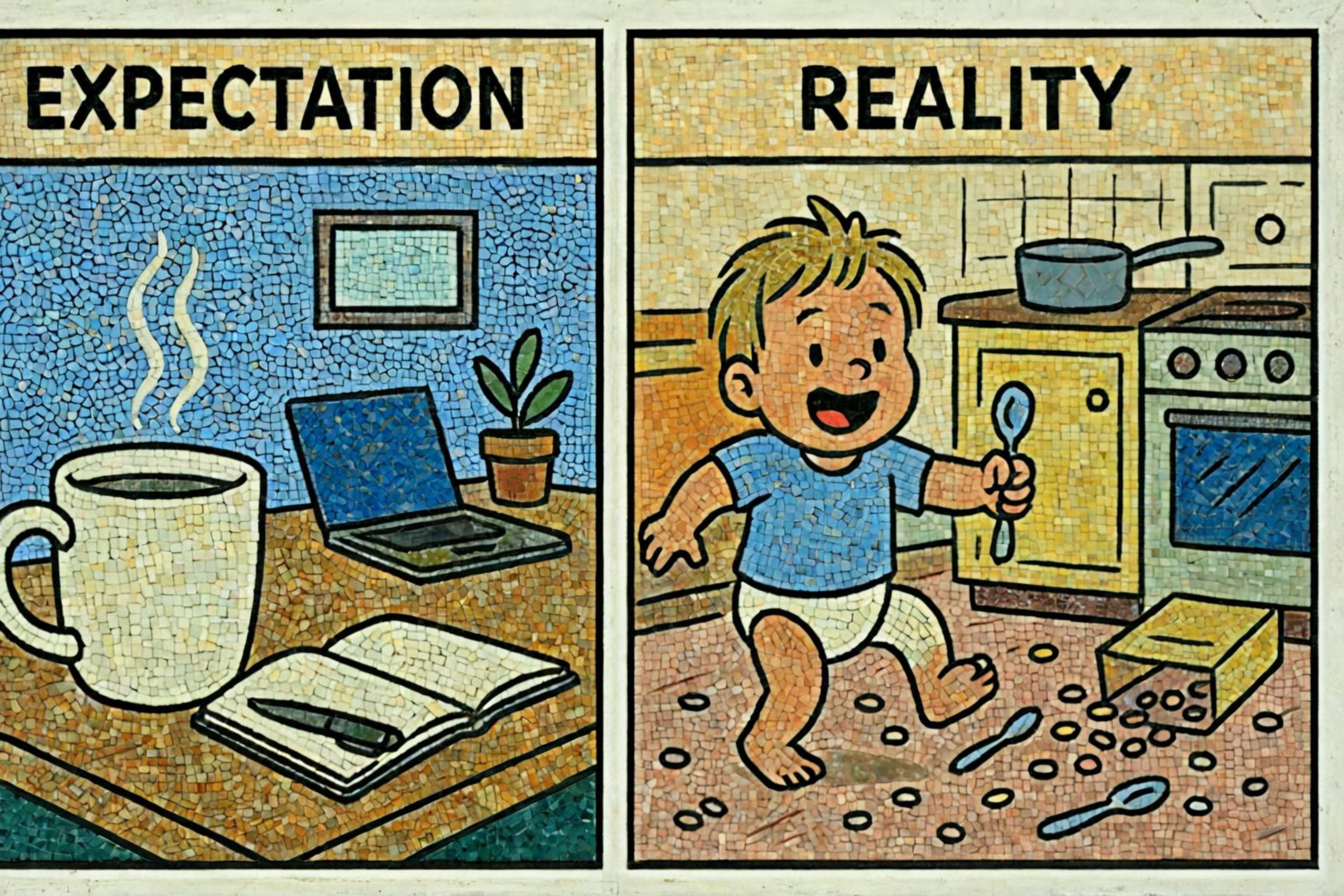 In cucina, il caffè non si prepara da solo (malgrado io continui a crederci ogni lunedì mattina). Samuele decide che il suo compito oggi è rovesciare la scatola dei cereali sul pavimento. Io, da padre responsabile, li raccolgo… e li mangio, perché lo spreco è un peccato, no?