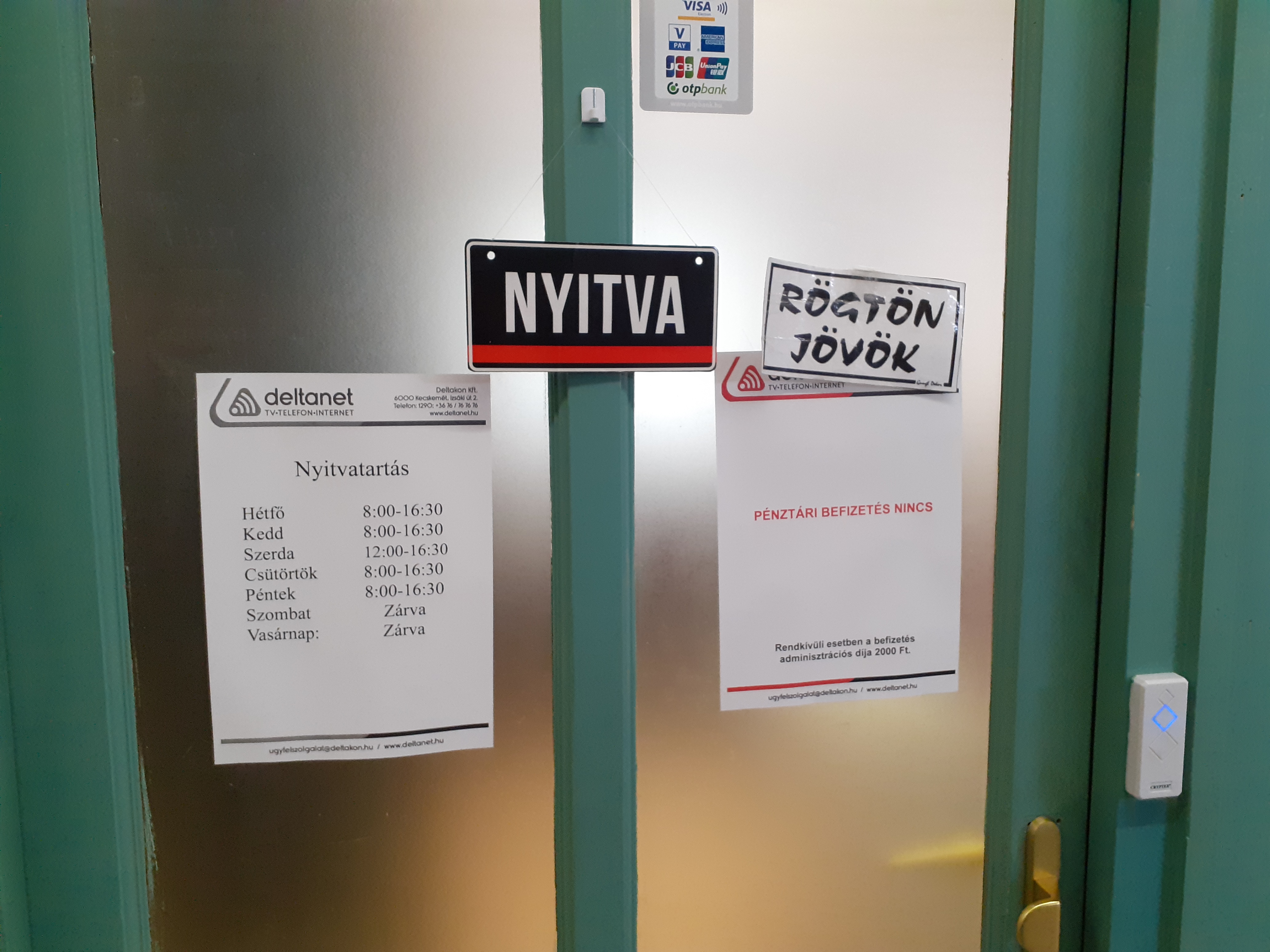 They should be open (nyitva) but it's closed and the paper at the right says they will be back any minute...