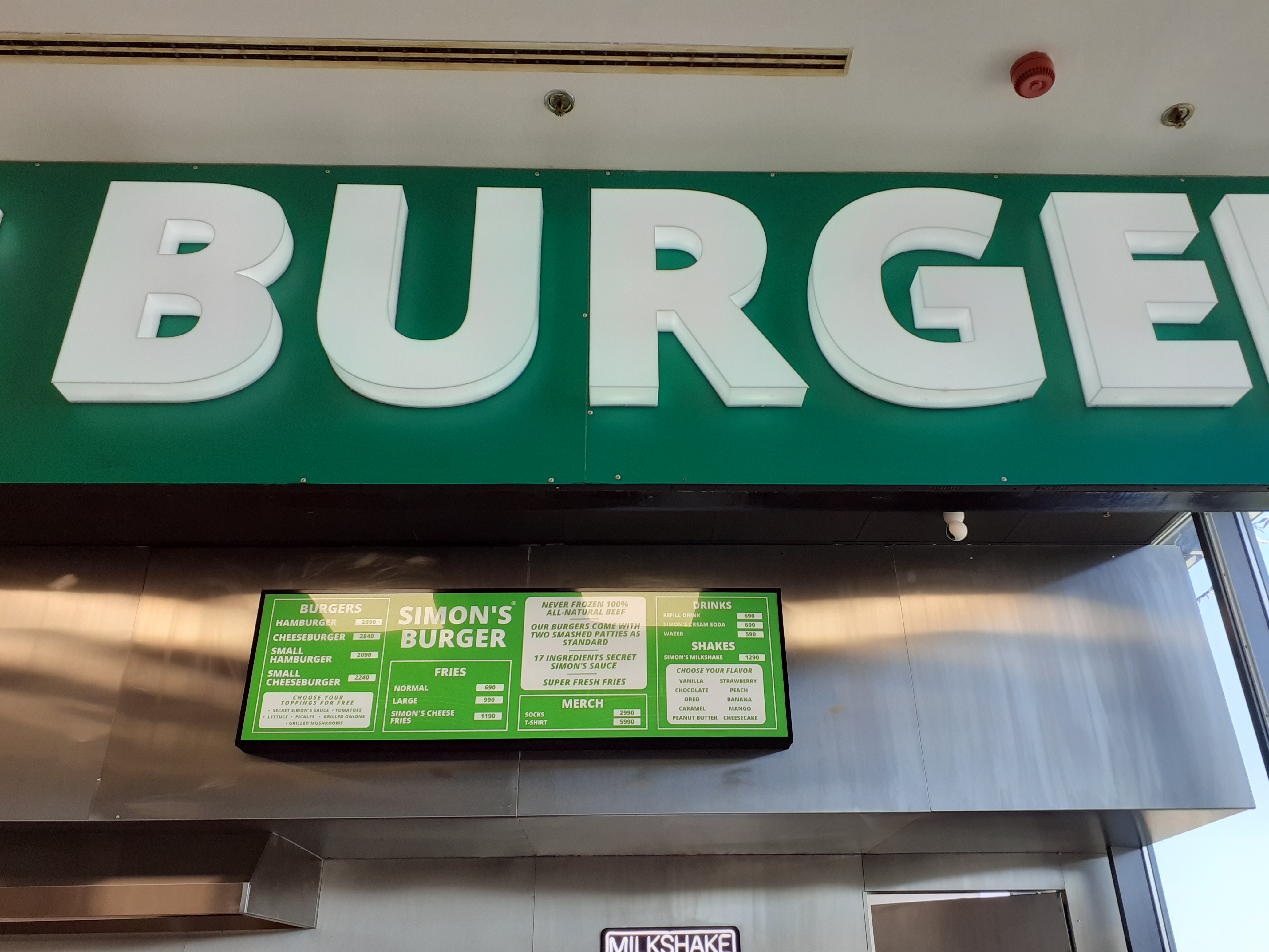 Il Simon's Burger è super! Sono passati anni da quando ho mangiato un frullato così gustoso e un ottimo hamburger schiacciato. L'azienda è nuova e Zi spera che i suoi standard siano elevati e che si faccia carico dei terribili prodotti chimici che le catene alimentari americane osano vendere.