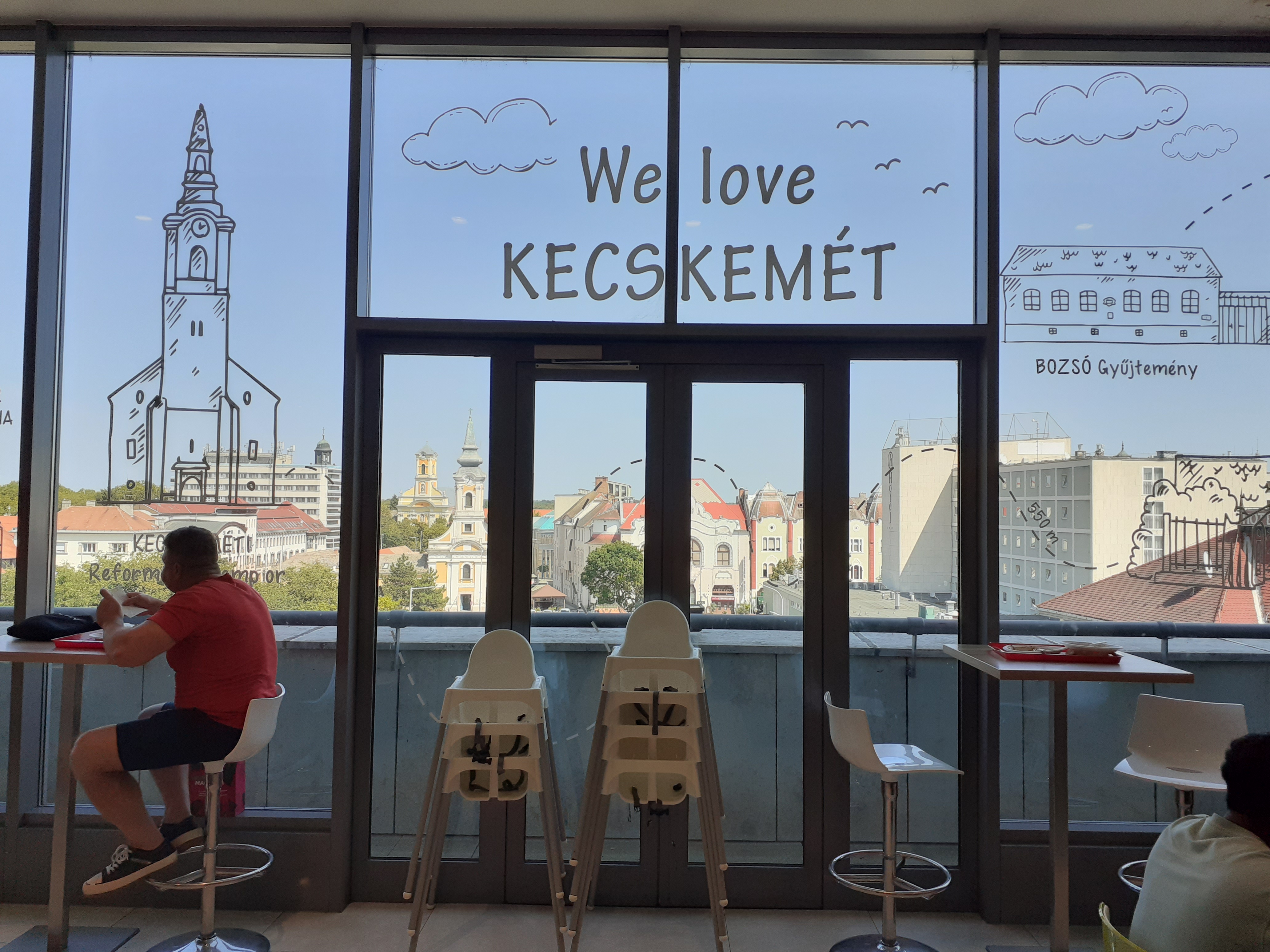 I like the window at the back of the part where the fast food restaurants are and the view over the city. If you look from a distance you see that all great architectural buildings are painted on this huge window.