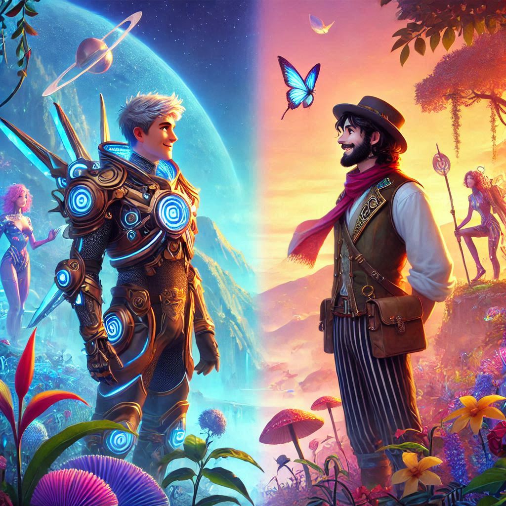 Wow, sei davvero figo. Sei io? Davvero? È difficile crederci. Com'è la vita nell'altra dimensione? Galassia, dici se è così come ci incontriamo? Da come vedo le donne non sono cambiate, vanno ancora in giro nude e con la stessa forma. Pensavo che l'altra dimensione sarebbe un posto migliore. Quindi stai dicendo che lo è. Mi chiedo se quella tuta ti tiene al caldo o è fatta di plastica e come fai a fare pipì o se cercare cibo e mangiare è inutile? Sei sicuro di essere io? Se è così come sei diverso? Anche due gemelli che non sono cresciuti insieme hanno più cose in comune di te e me. Ti sei tinto i capelli? Adoro il tuo sorriso, hai una faccia amichevole a differenza di quelli in questa dimensione. Allora come si chiama il posto in cui vivi? Galassia o non esiste? Hai idea se invecchiamo o se non importa visto che il tempo esiste solo nella nostra mente? Quindi hai a che fare con l'era glaciale, dici? Mi chiedo, te lo sei inventato visto che quella tua tuta non sembra tenere il corpo al caldo o sei un robot, una parte del mio cervello in una macchina che ti fa sembrare diverso da me? Niente barba ma il mento è lo stesso... Non riesci a parlare, sorridi e basta? Ehi, prima di andare puoi prestarmi il tuo raisor? Fa caldo nella mia dimensione e il sudore mi fa puzzare. A differenza delle donne che vanno in giro nude non è appropriato. Ti piacciono le farfalle? Puoi prenderle, sono l'unico animale domestico che ho e sembrano vivere per sempre. Grazie per il rasoio amico, ti do anche un fungo se riesco a tenerlo. Ci vediamo in giro in futuro.