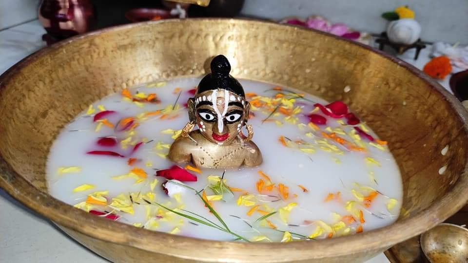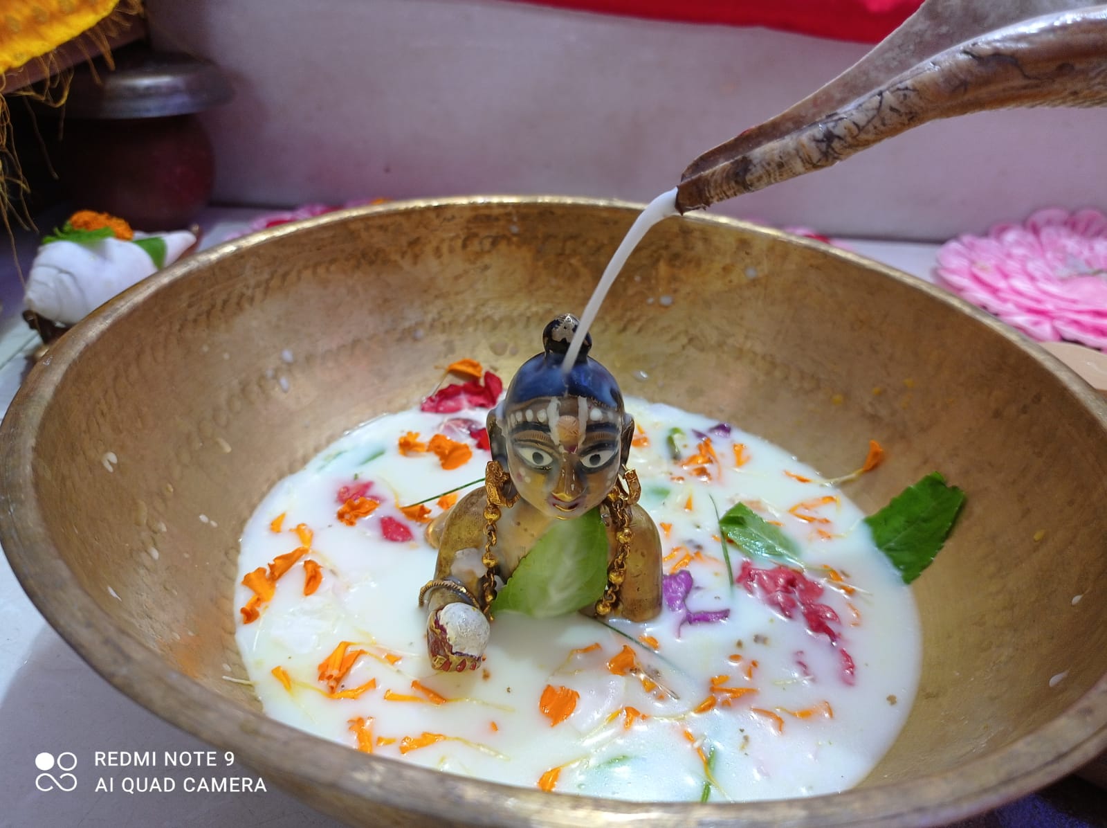 মা এসে গোপালকে দূর্বা,হলুদ ,মধু দই ,দুধ ,জল দিয়ে স্নান করালো।