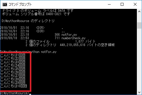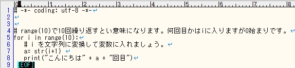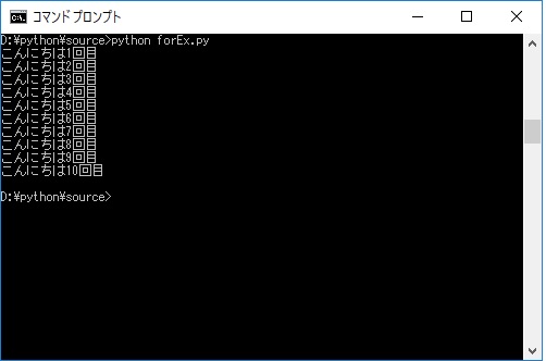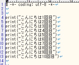 「こんにちは」と10回表示させるプログラミングを作ってみましょう。