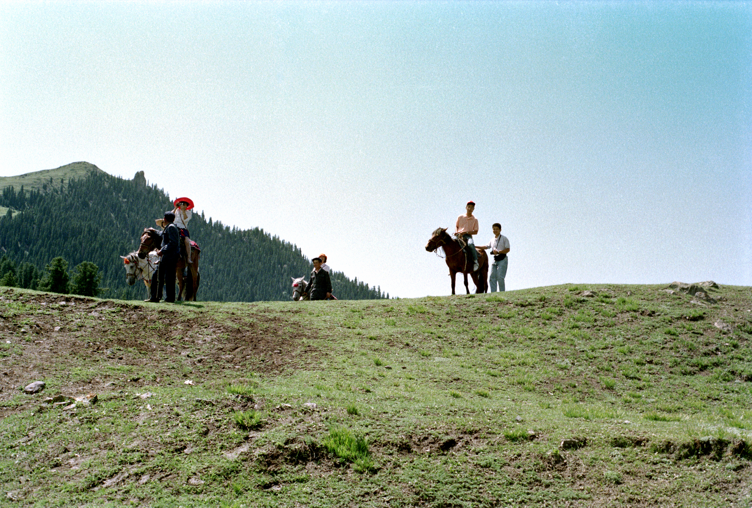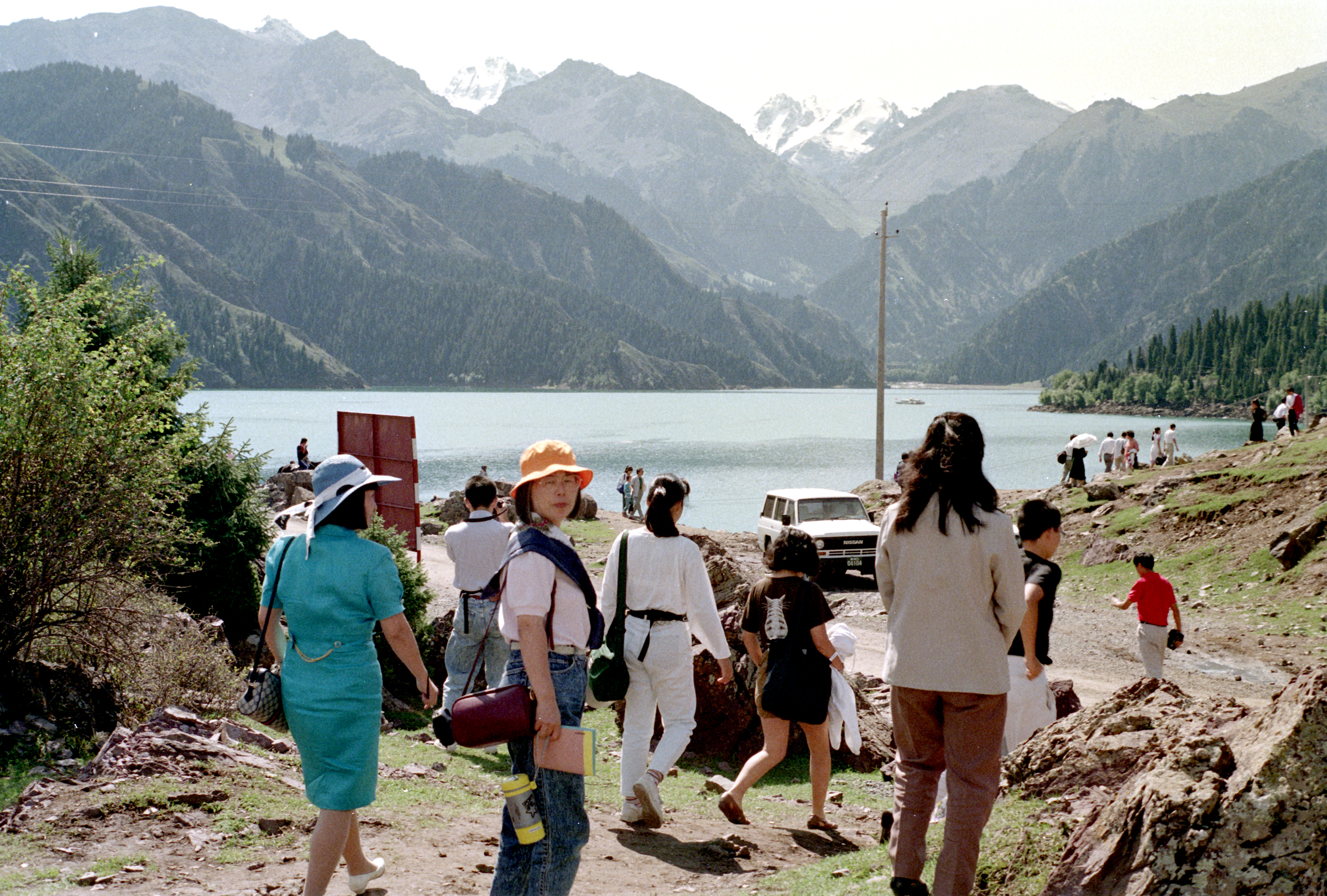 1991年8月、鉄道で新疆ウイグル自治区の烏魯木斉(ウルムチ、烏魯木齊市、Ürümqi、ئۈرۈمچى)まで行き、烏魯木斉に宿泊。そこからバスで行った天山山脈にある大きくきれいな池とその周囲にある観光地、天山天池风景区です。池の周りは観光者用にしつけられた馬に乗って巡ることができました。