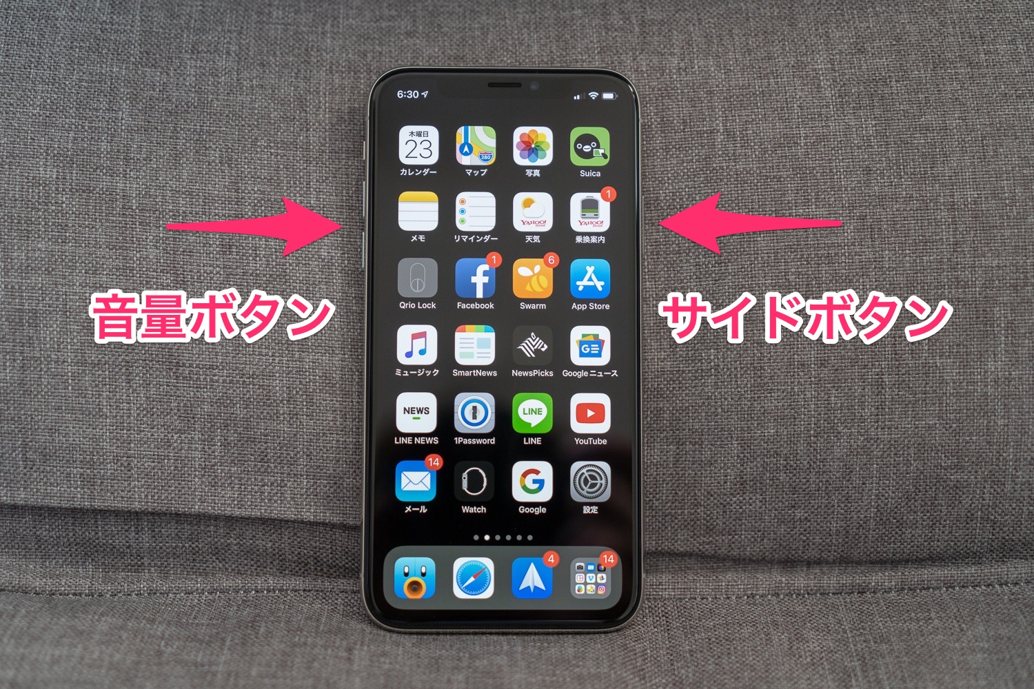 iPhone Xで電源を落とすには、「サイドボタン」と「音量ボタン」(プラス、マイナスのどちらでもOK)を、スライダーが表示されるまで同時に押し続けます。