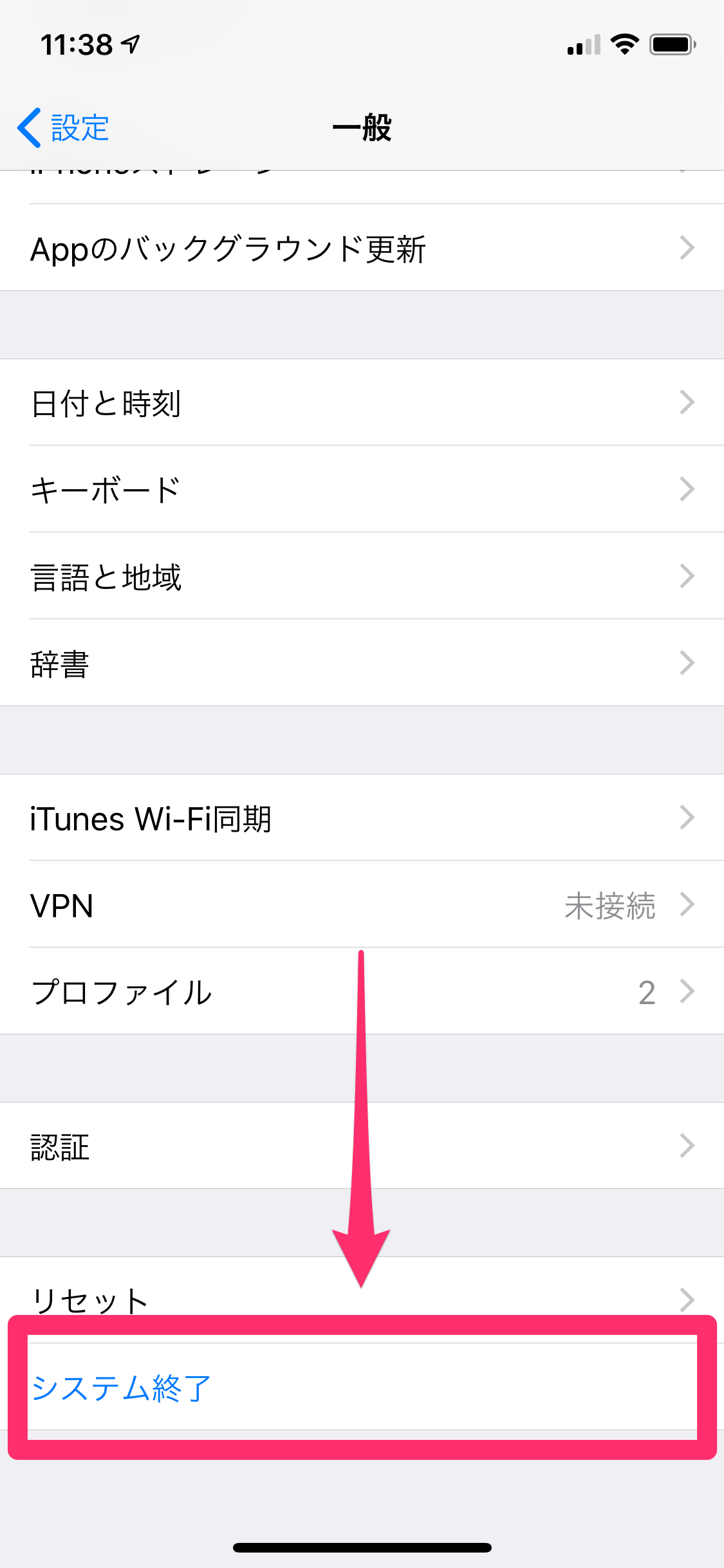 まず「設定」アプリを起動し、「一般」をタップして一番下までスクロールすると「システム終了」があるのでこれをタップします。