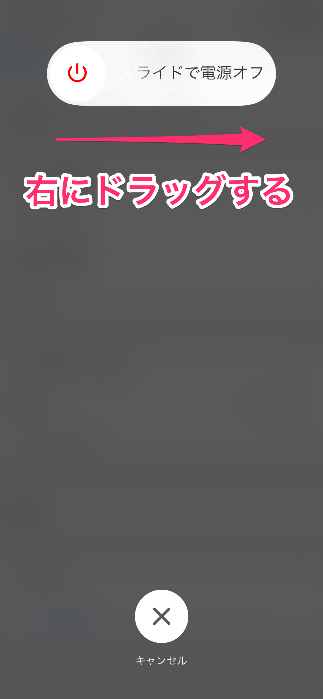スライダーが表示されたら、右にドラッグするとiPhoneの電源が落ちます。しばらく待って電源が完全に落ちたことを確認し、「サイドボタン」をAppleロゴが表示されるまで押し続けてください。